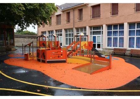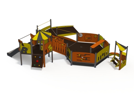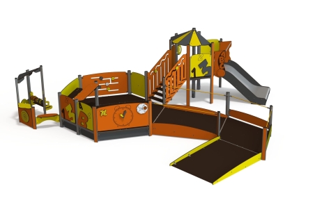A large inclusive multiplay unit with play panels, single slide, double width slide, climb net, climb wall, platforms and sheltered seating. A wheelchair friendly ramp allows access to the play unit to allow inclusive play.