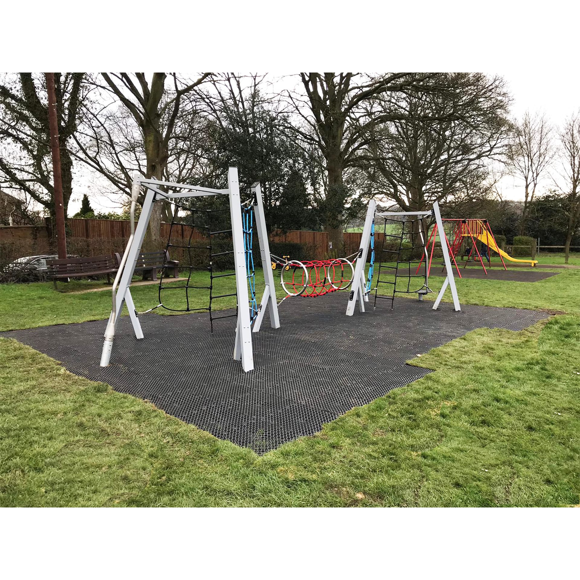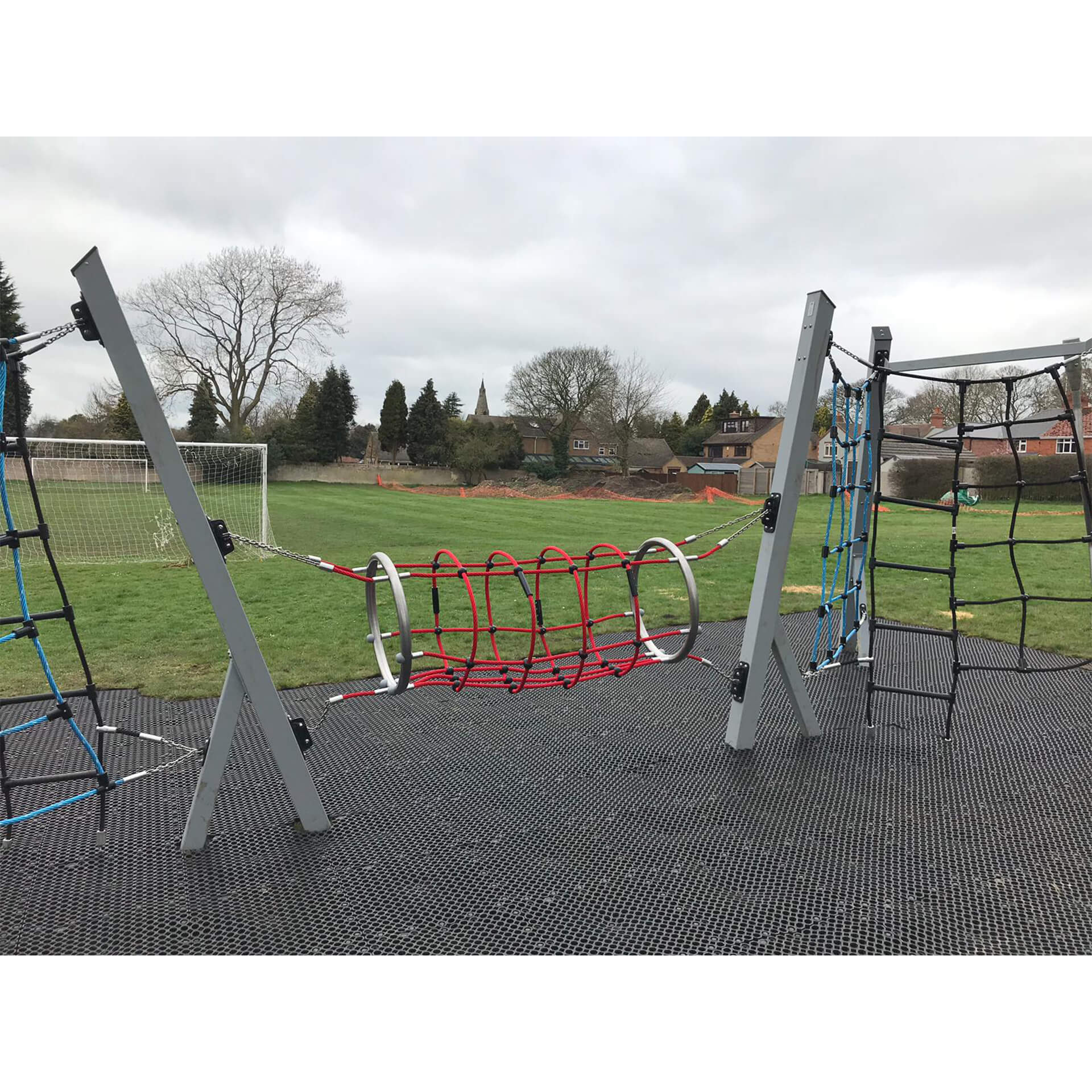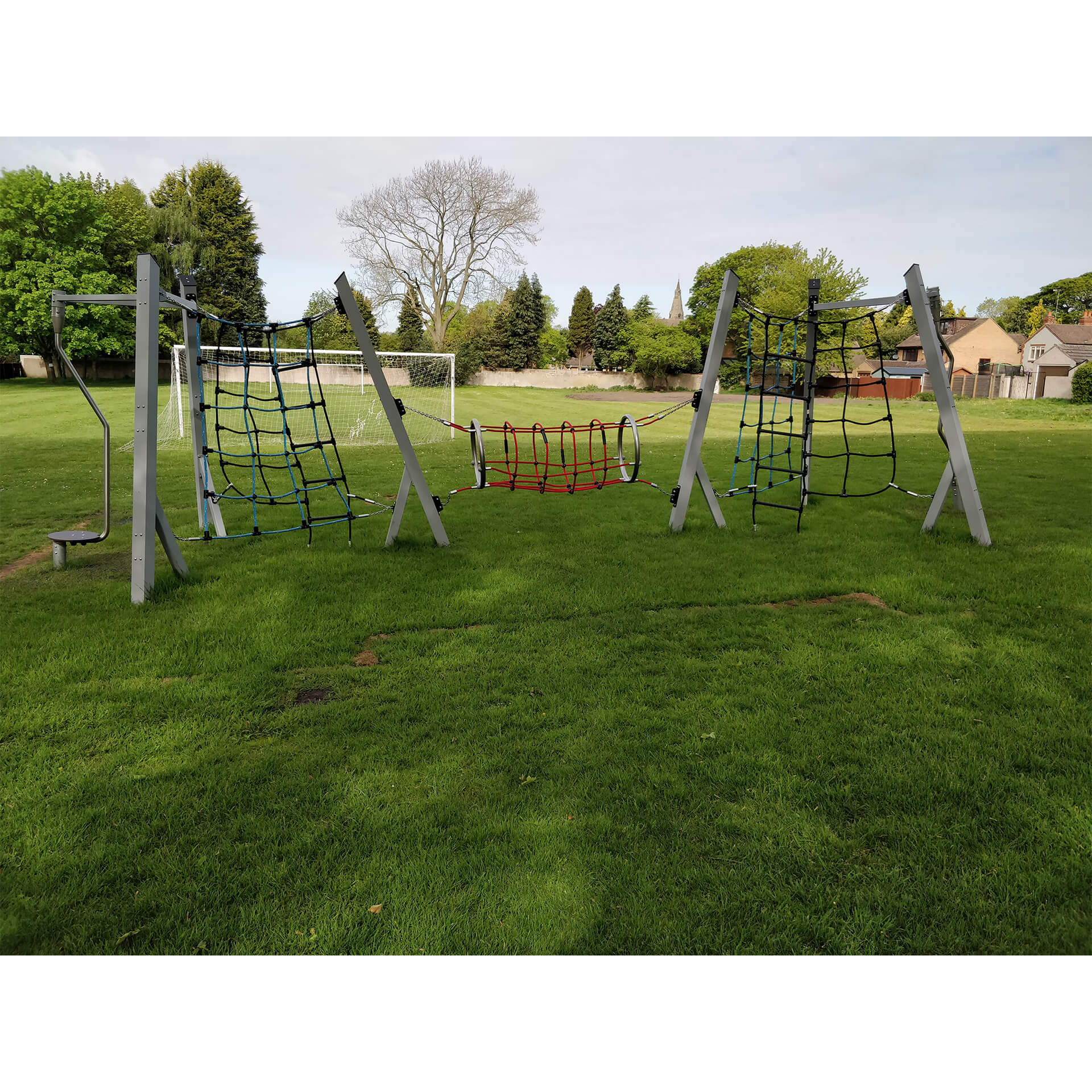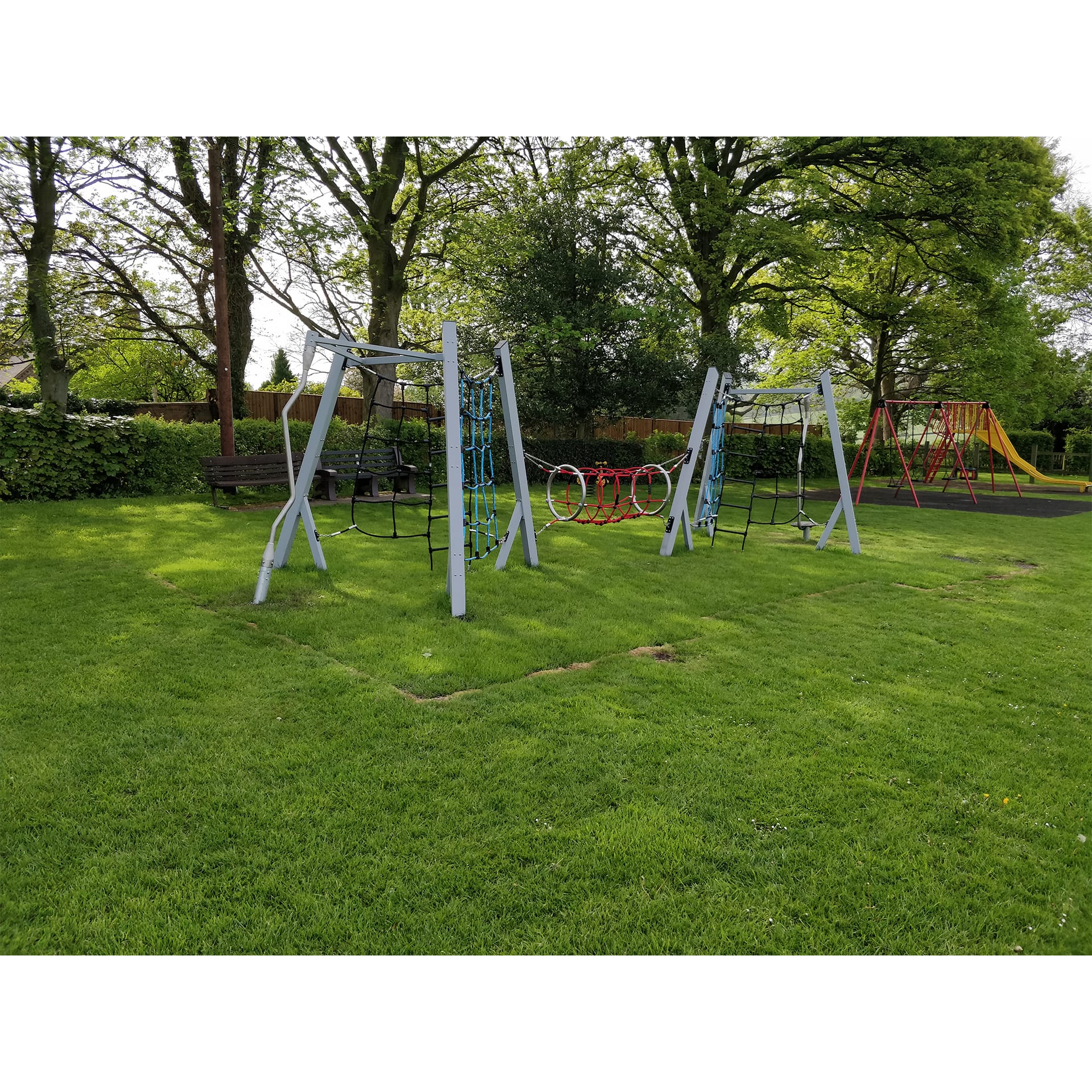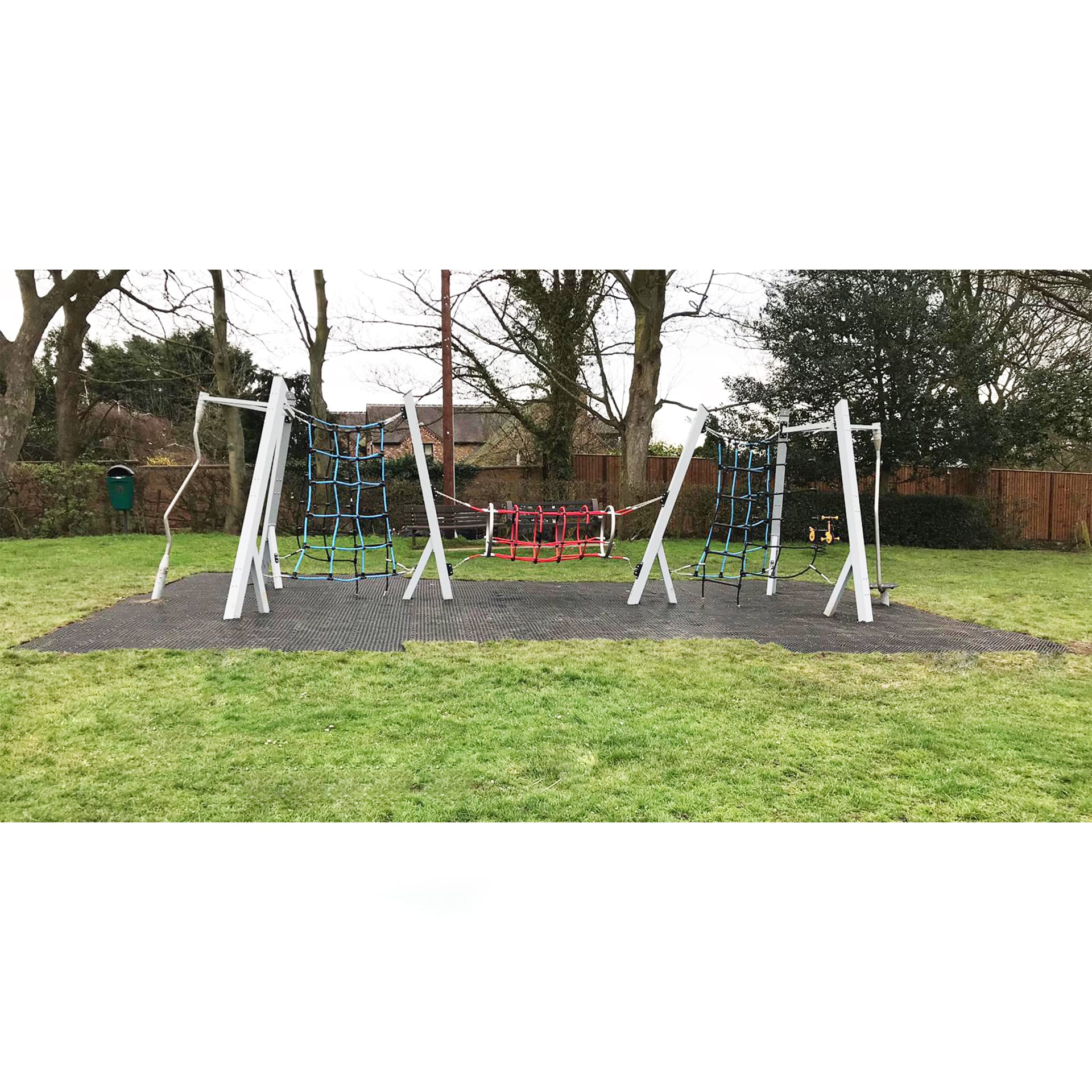 The Nettix unit chosen offered a steel framework with steel rope core, great play value for older children with climbing and spinning. Grass matting surfacing was also requested to help with the wear on the grass long term.