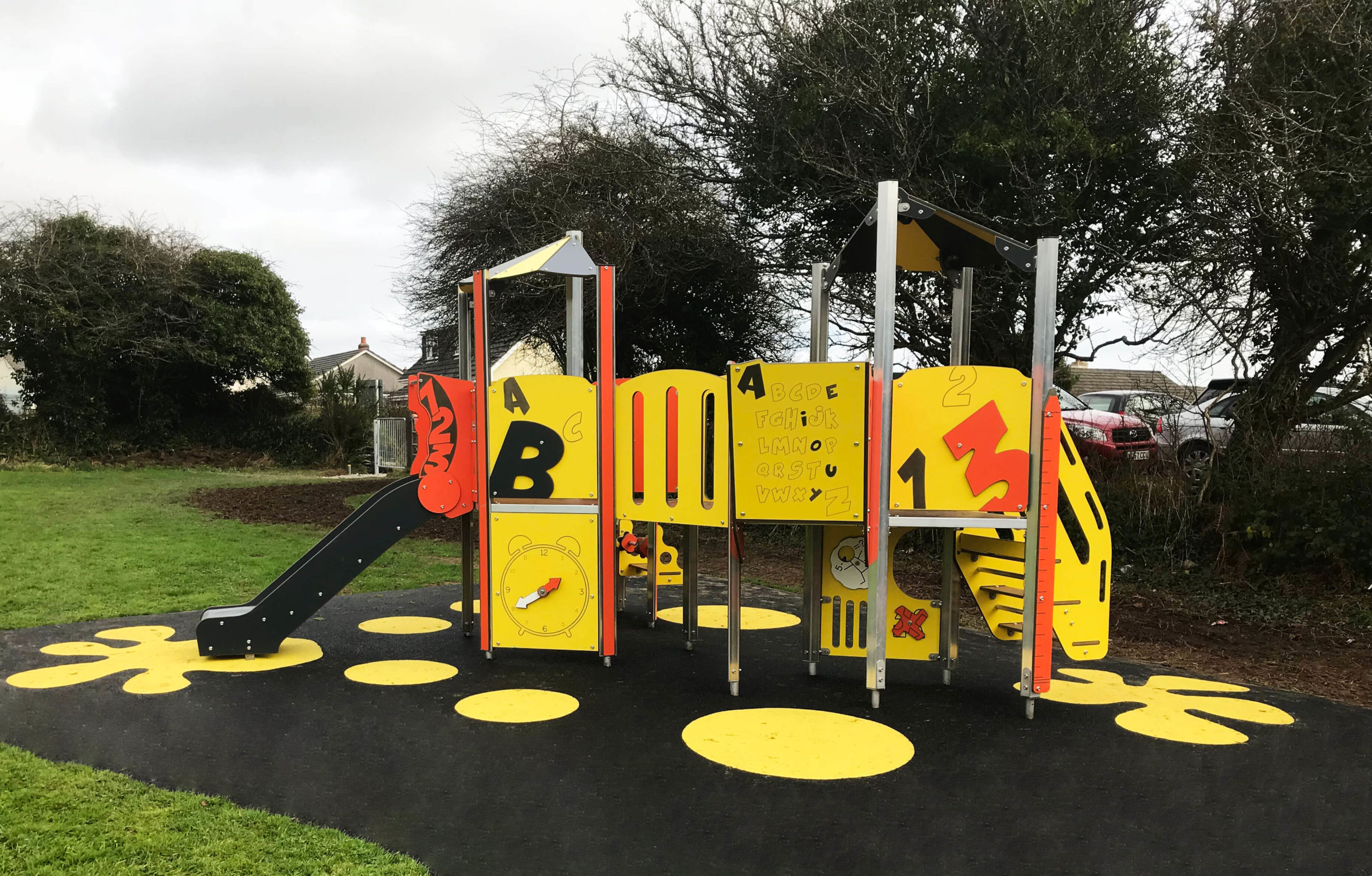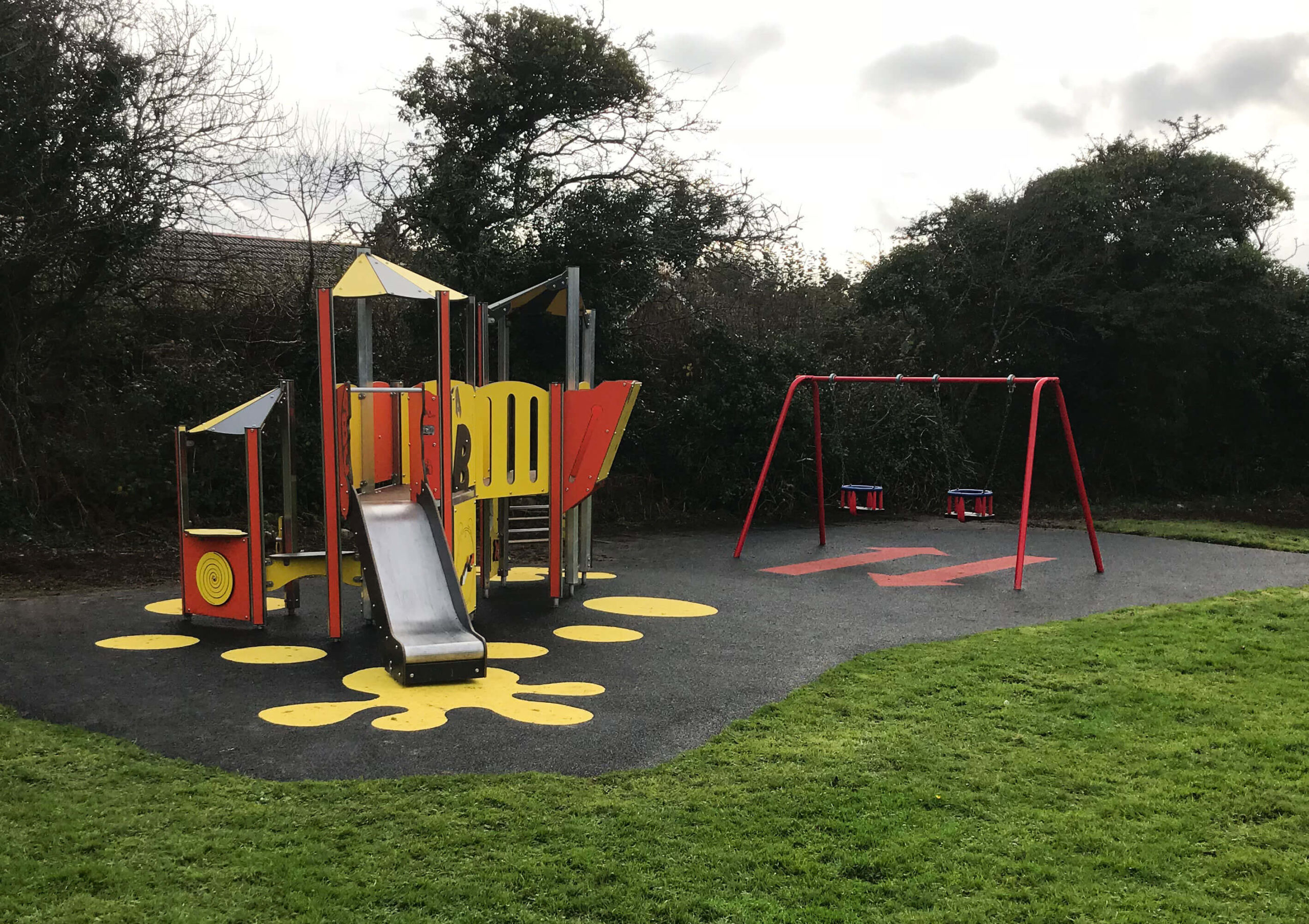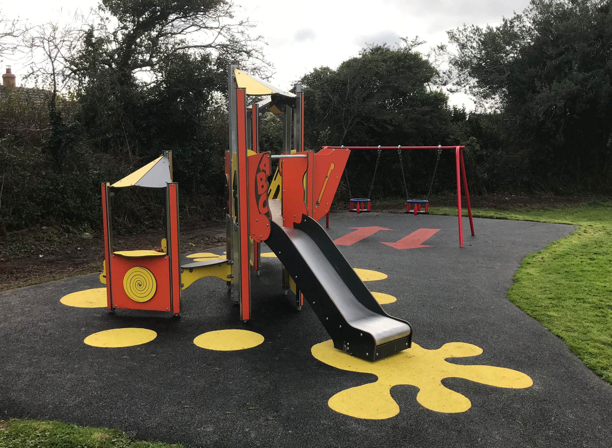 The site has provided a vibrant and colourful play area to Sticker Park. The main yellow and orange play unit has over 15 play features so is perfect for lots of children to explore with lower level play panels and play spaces for early years. The infant swings also compliment this space nicely, giving a play space for all ages.