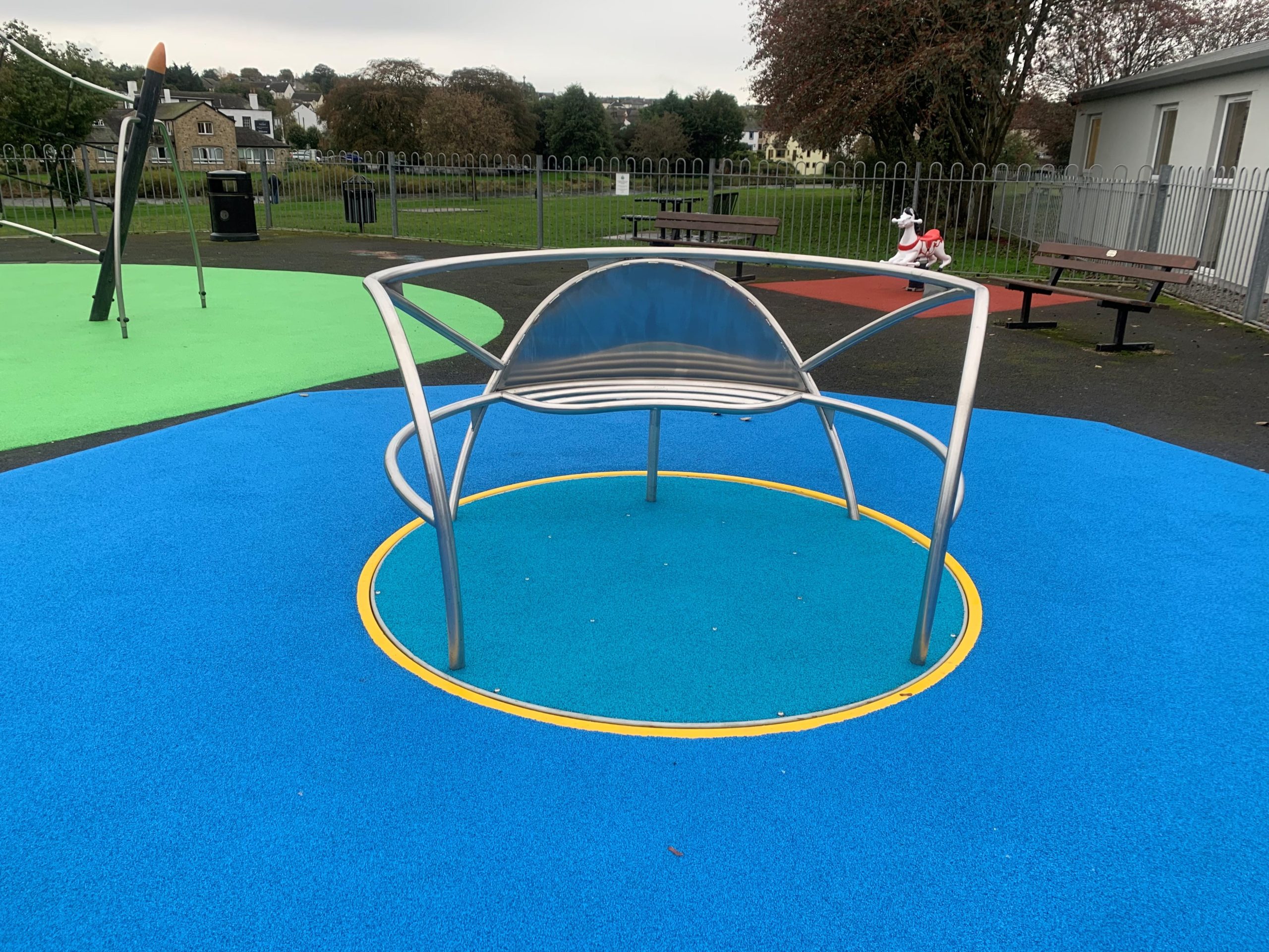 The Client wanted to remove their existing wetpour surfacing and lay new colourful wetpour across the equipment on site. The Client also wanted to instal a new wheelchair friendly roundabout on site.