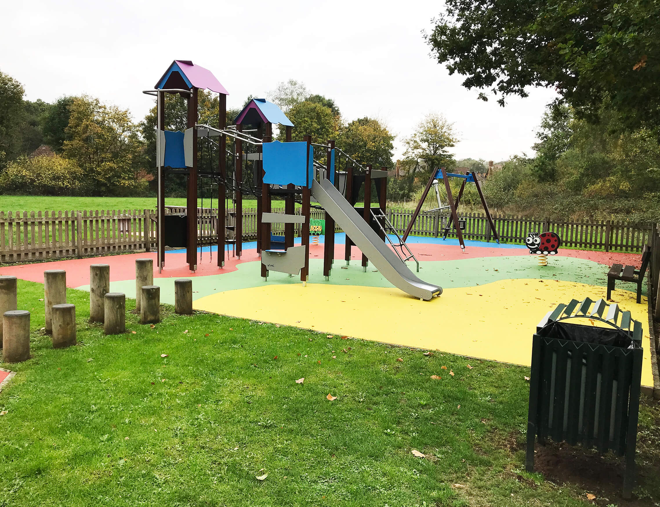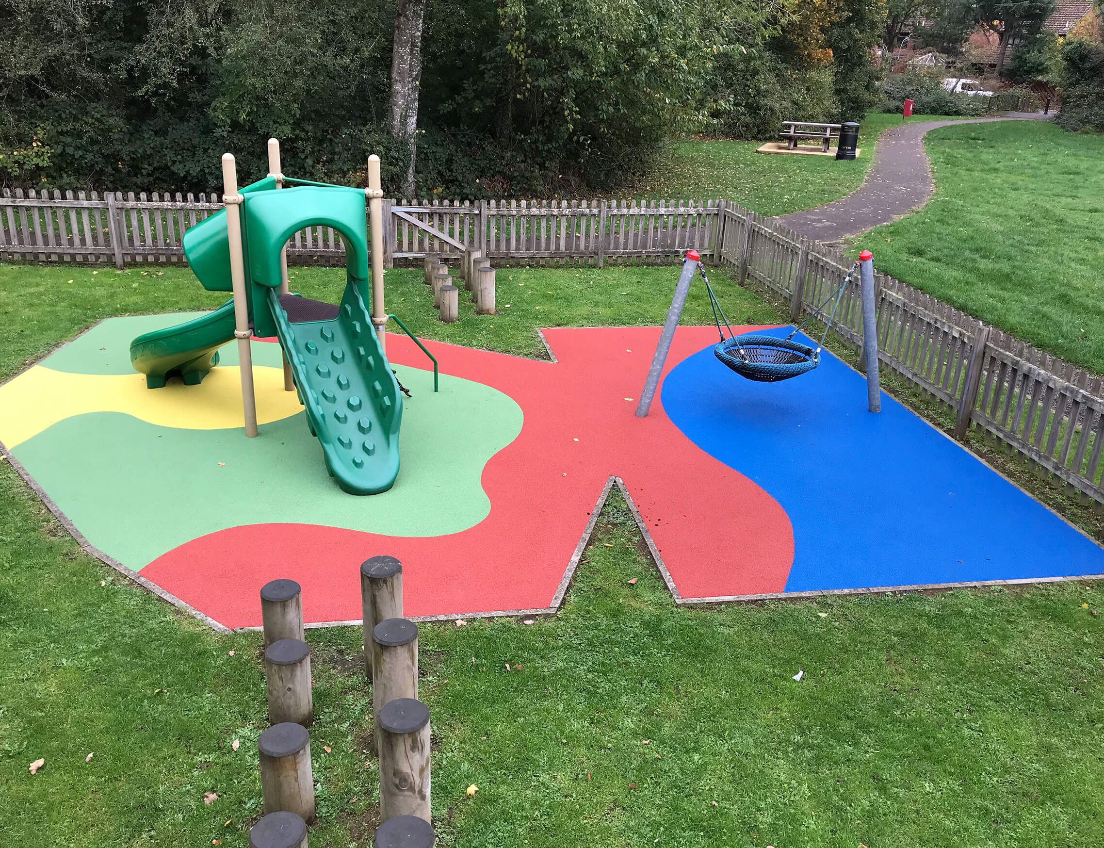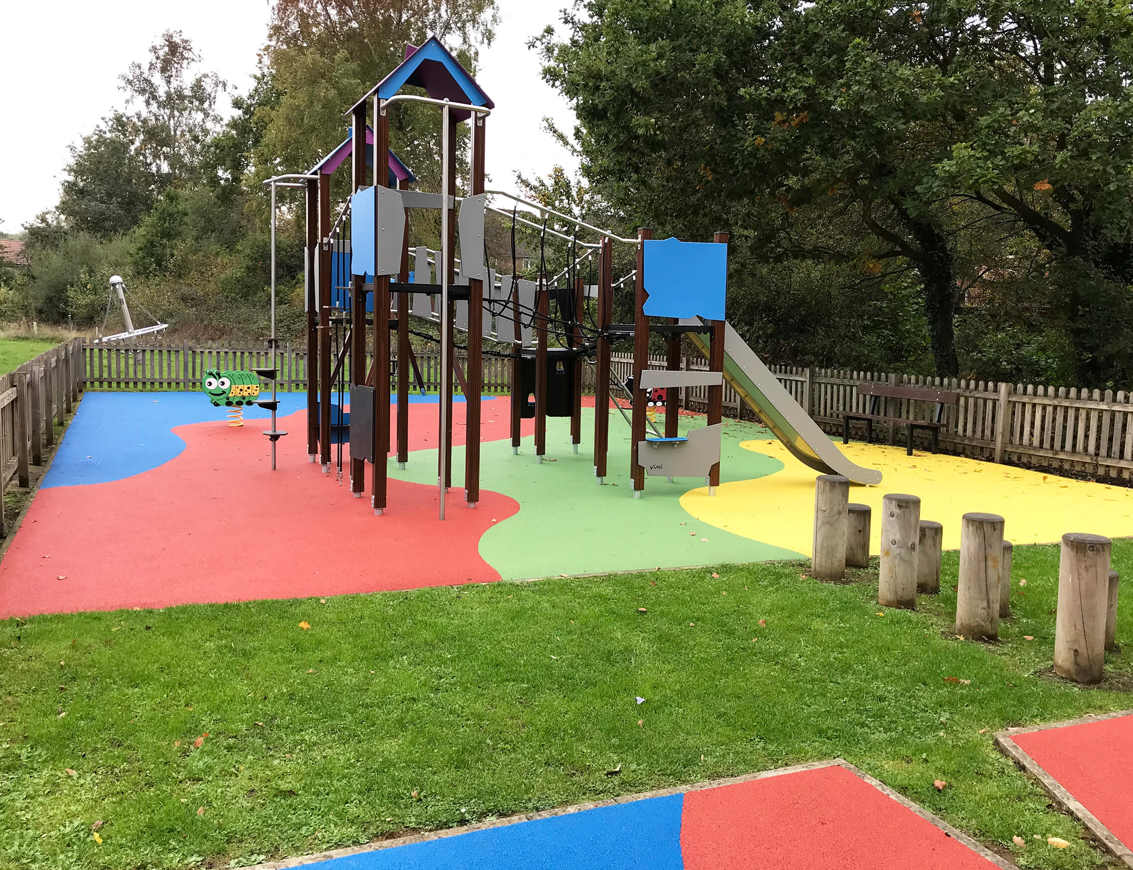 The Client were looking to transform an existing playground with new colourful wet pour surfacing around existing kit. The Client were also looking for a large multiplay unit for all age groups to be installed alongside a new swing set.