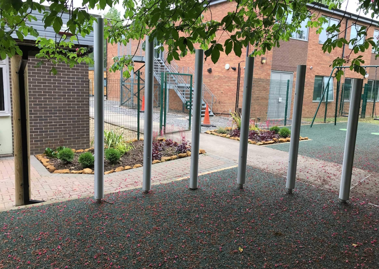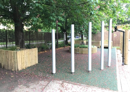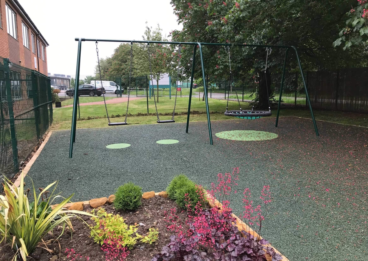 The Client was looking to build a sensory play space within their grounds. The existing site was a grass space which was prone to water build up during heavy rain. The client was looking for a drainable surface solution alongside musical playground units and a double bay swing.