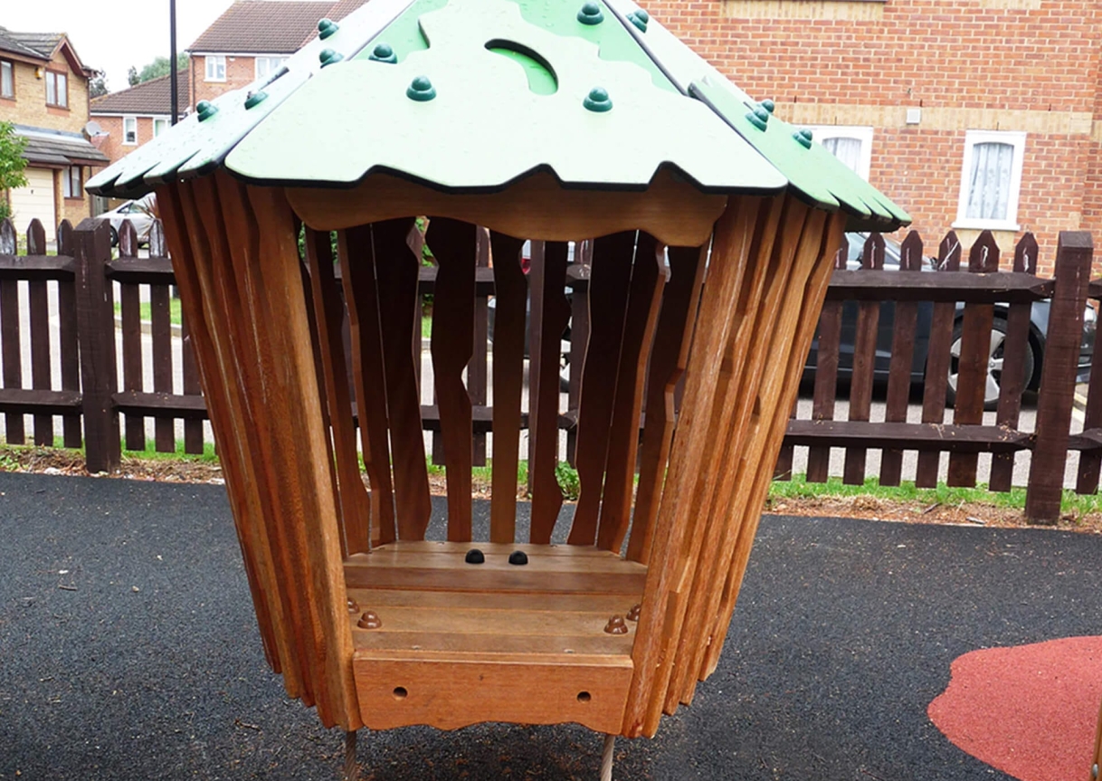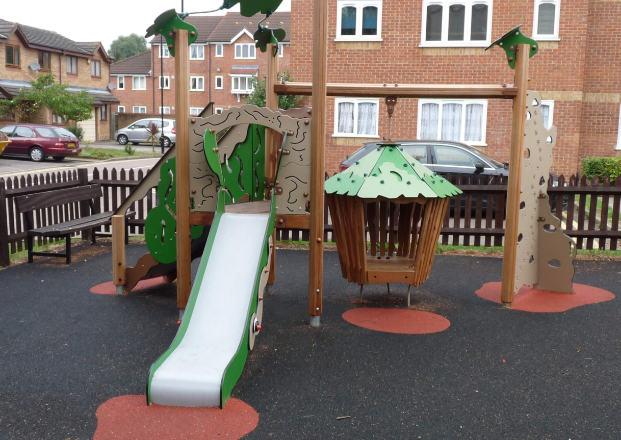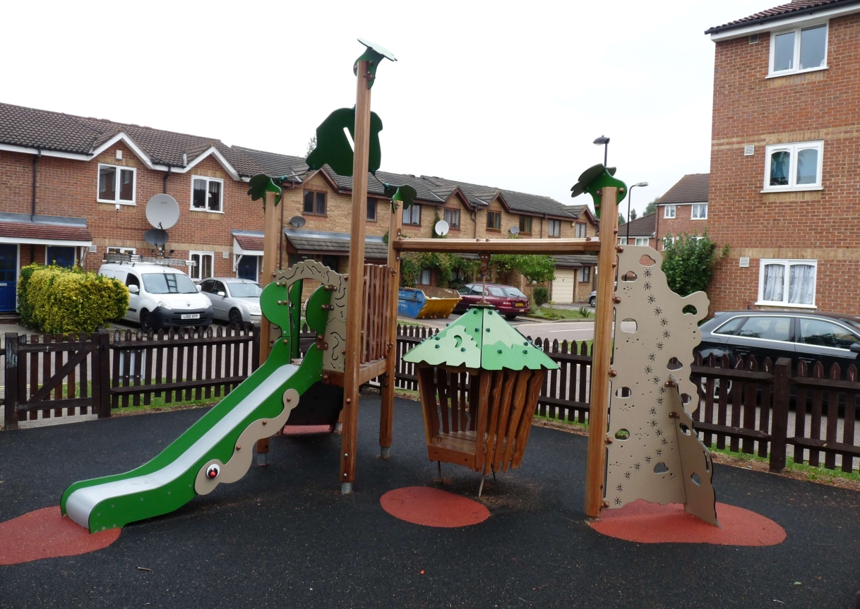 The Client wanted a small play area to be updated with new surfacing and a play unit for age 2-8 year olds. The Ankor play unit provided the best solution, for users aged 2+, up to 8 users and compact in size. The unit contains three play units for different abilities, with a fantastic slide, jungle hut and climb wall.