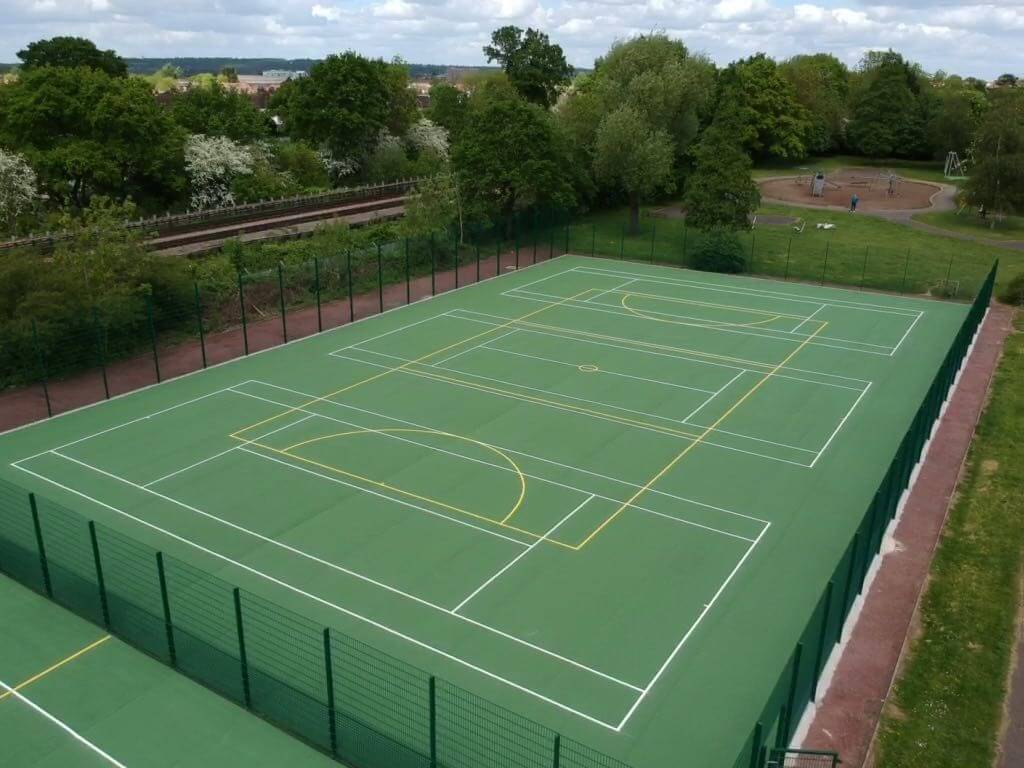 The Client were looking to install a large triple MUGA to incorporate a range of sporting options. Surfacing was to be green coated tarmac with line markings. To create a MUGA size of approx. 50m x 30m x 3m high divided into 3 separate areas.