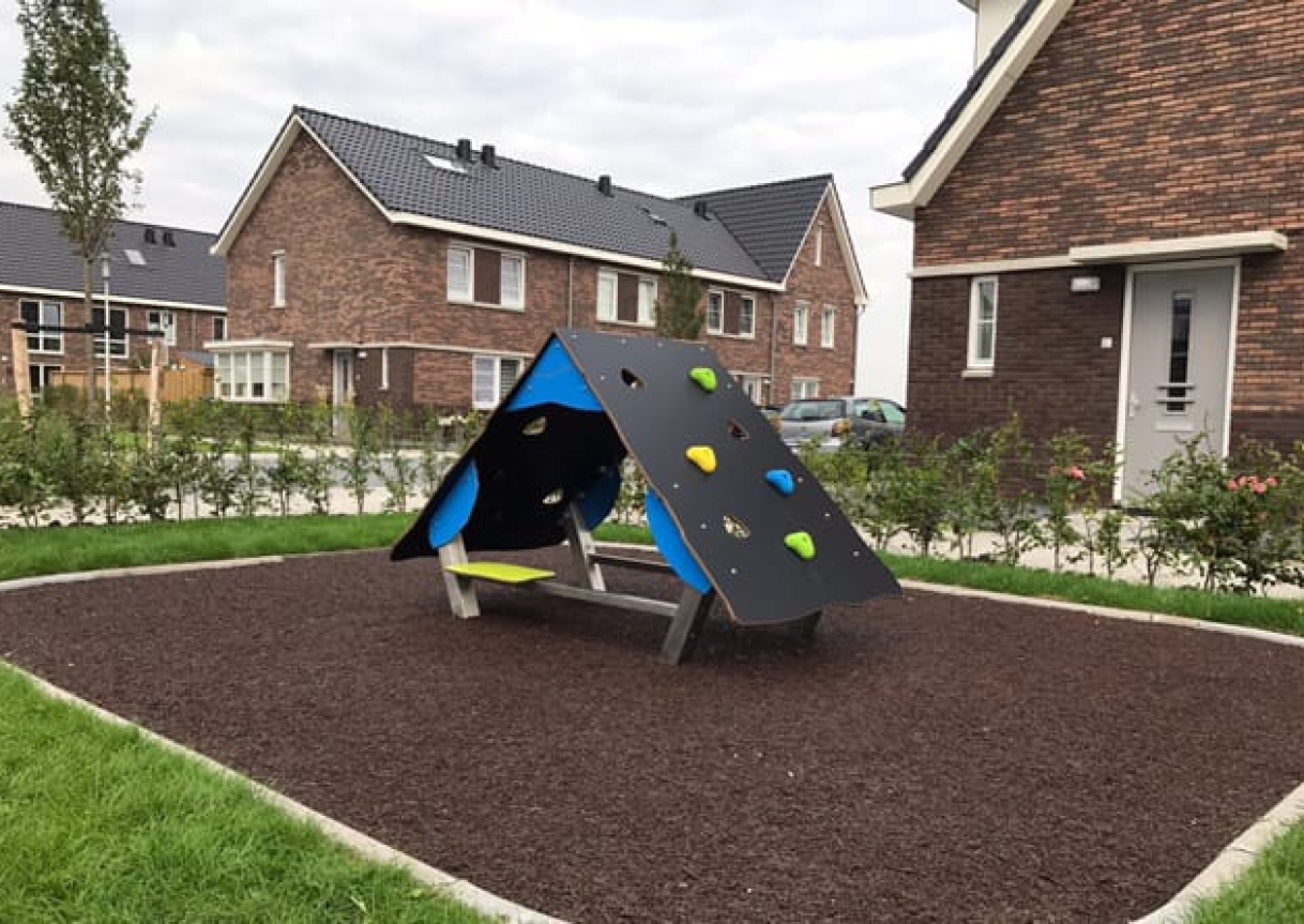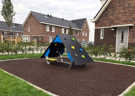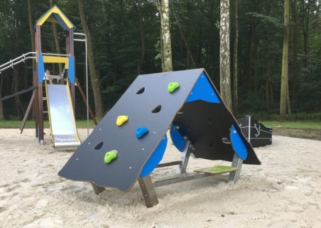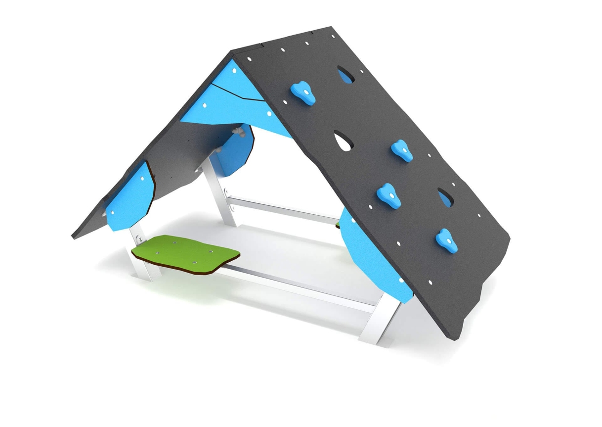 A lovely small climbing wall for all ages. With two sloped sides with hand and foot hold and under unit seating.