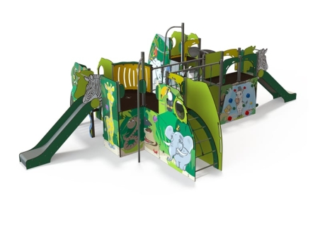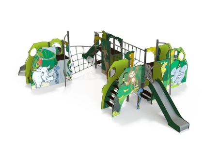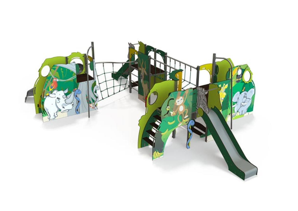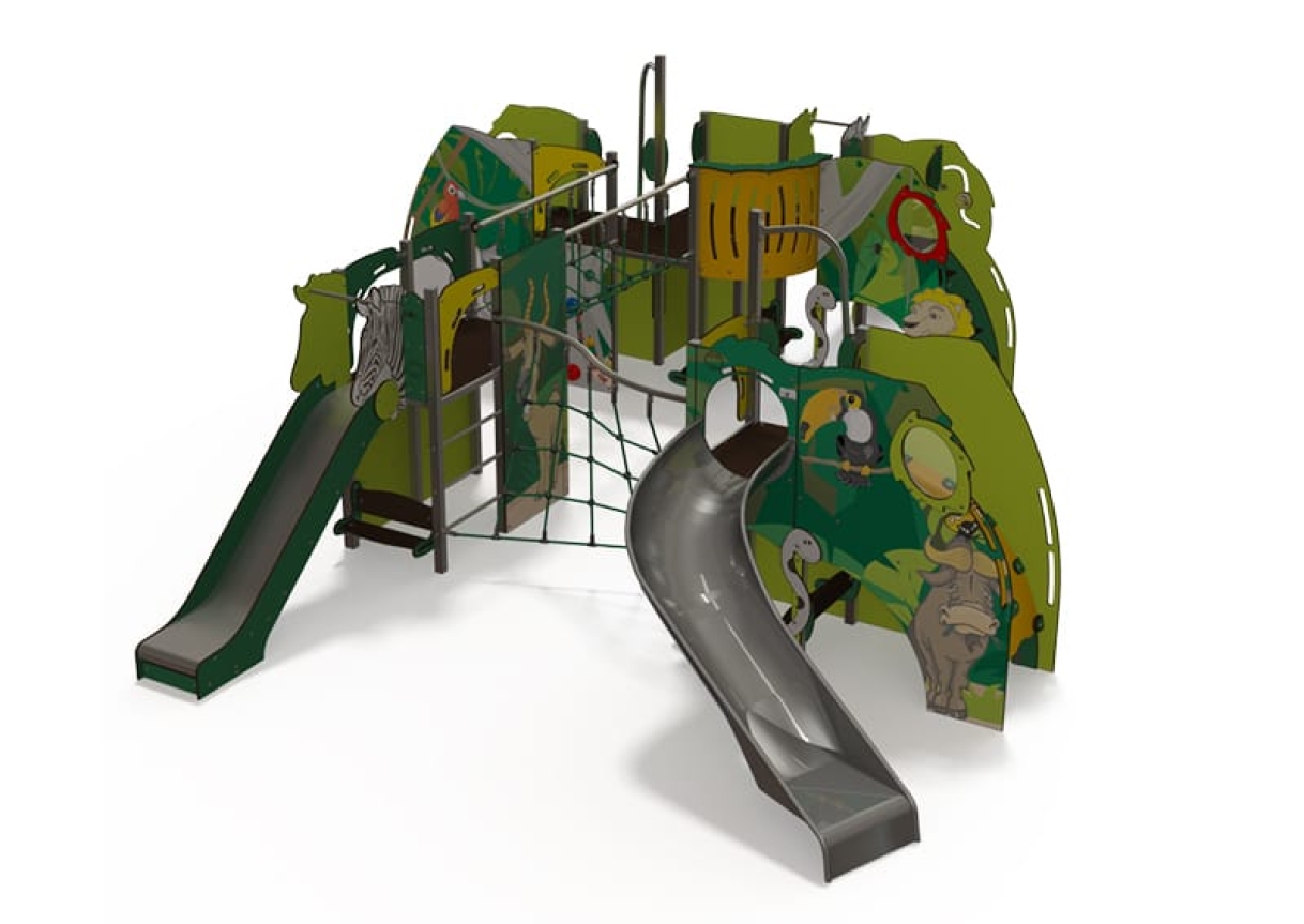 A large deluxe playground unit with Zoo animal themed panels. This wonderful unit features two traditional slides, half tube slide, twisted climb net, curved climb steps, under unit seating, two firemans poles, rope bridge, easy access stairs, curved rope ladder, climb walls and a look out platform.
