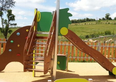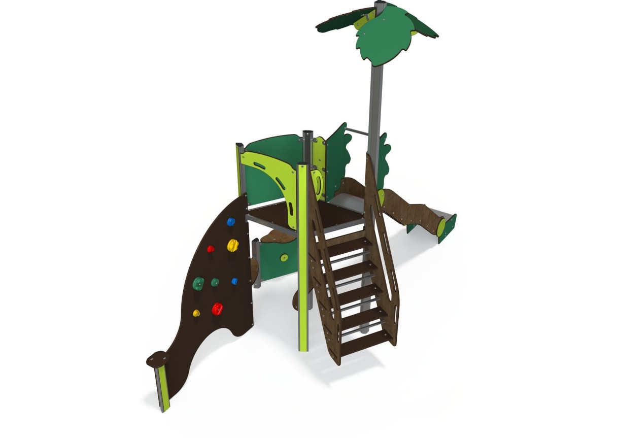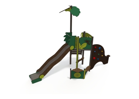 A great small space unit with slide, climbing wall, seating and kiosk space, play panel and stairs.
