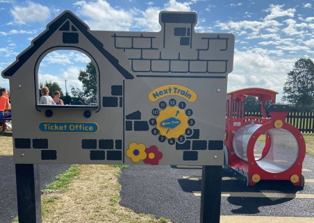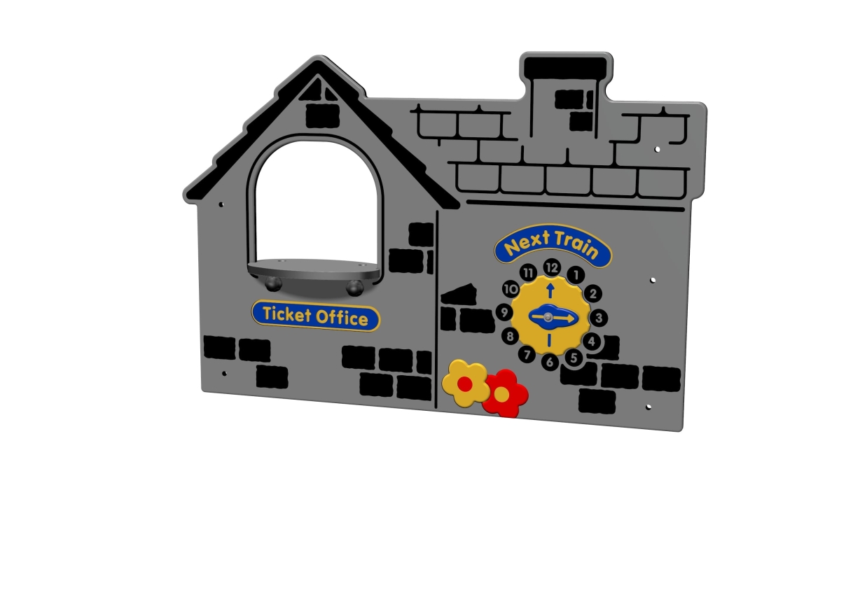 Ticket Office play panel with recycled plastic posts. Includes ticket counter and clock with rotating hands. Great for role play.