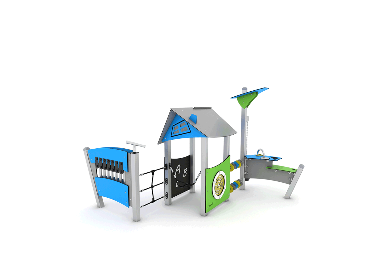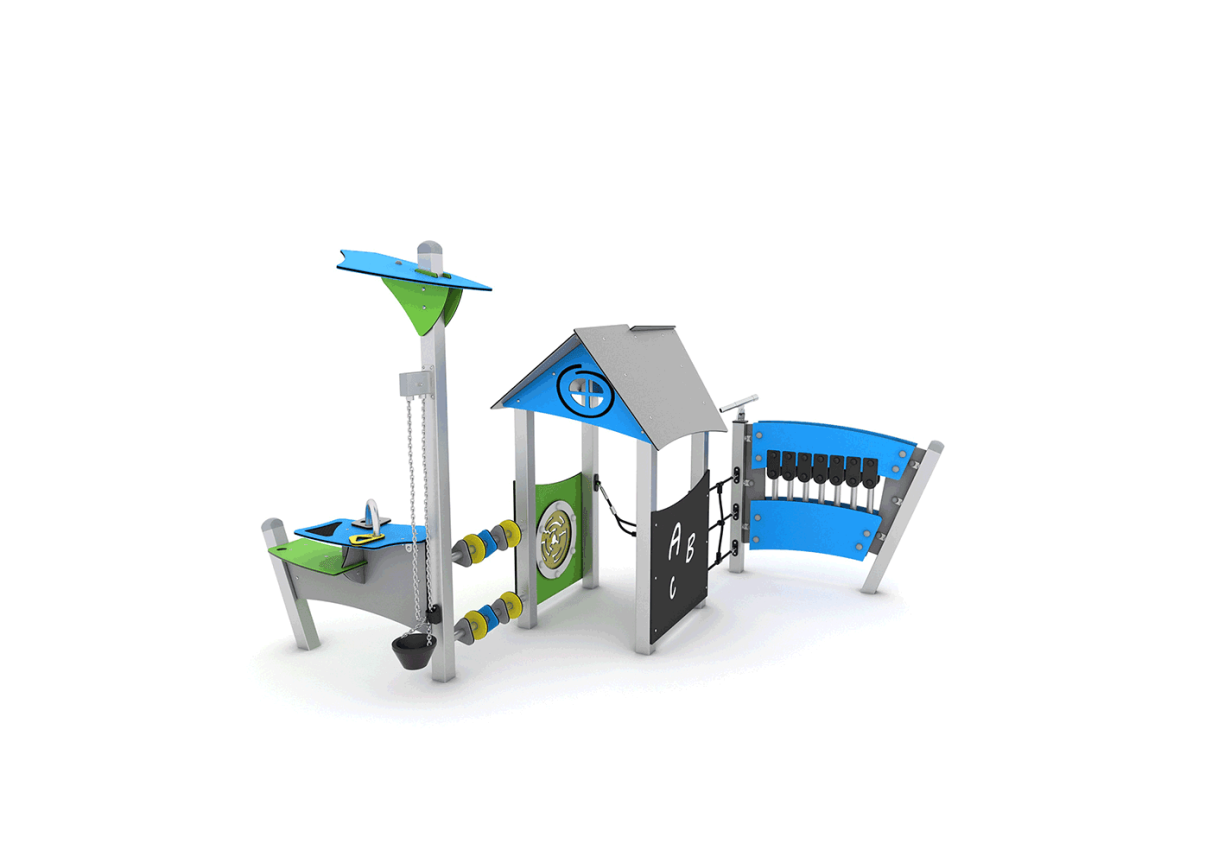 Designed to improve motor and social skills, children can explore the rotating shapes, play panels, climbing net, water bucket and musical pipes.
