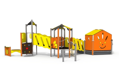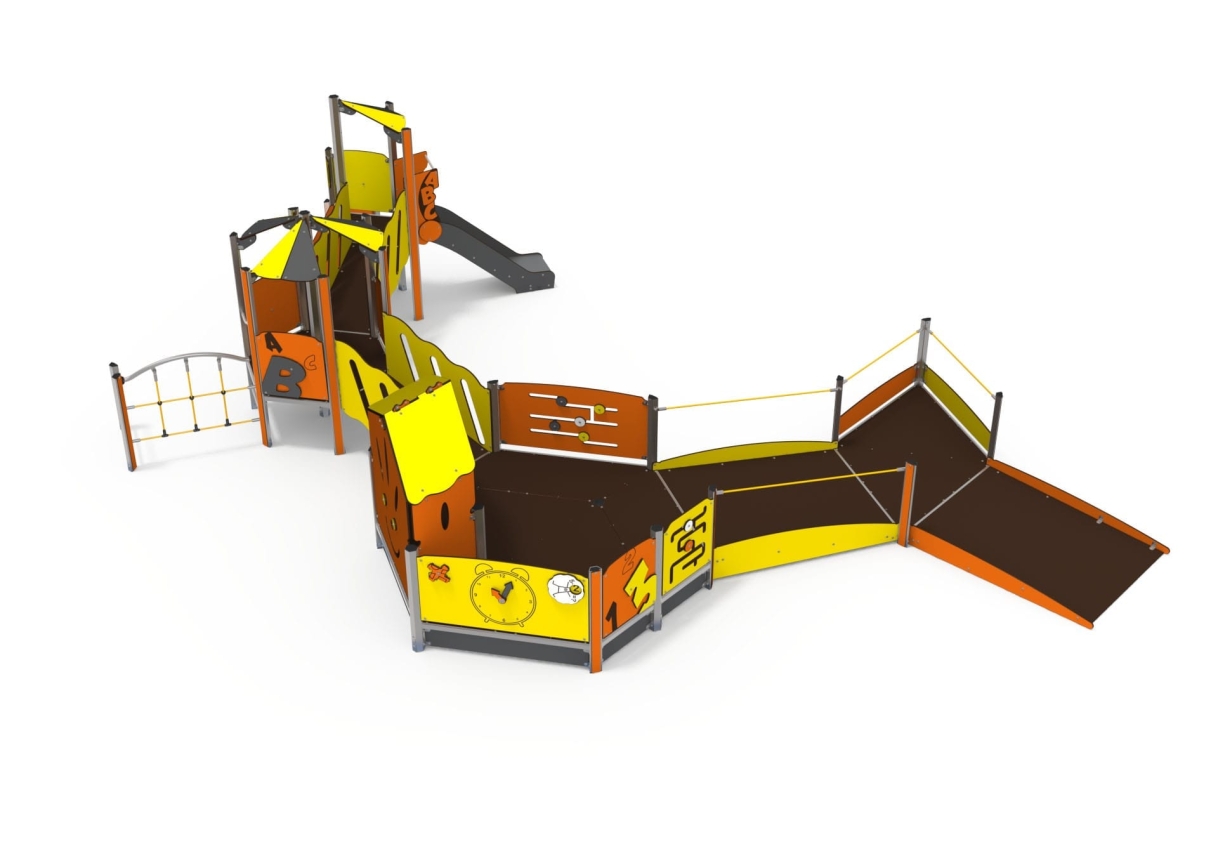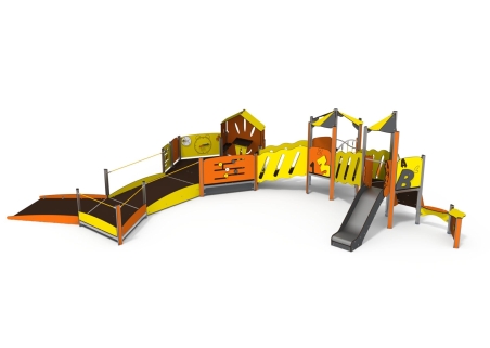 An inclusive multiplay unit with play panels, slide, climb net, platforms and sheltered seating. A wheelchair friendly ramp allows access to the play unit to allow inclusive play.