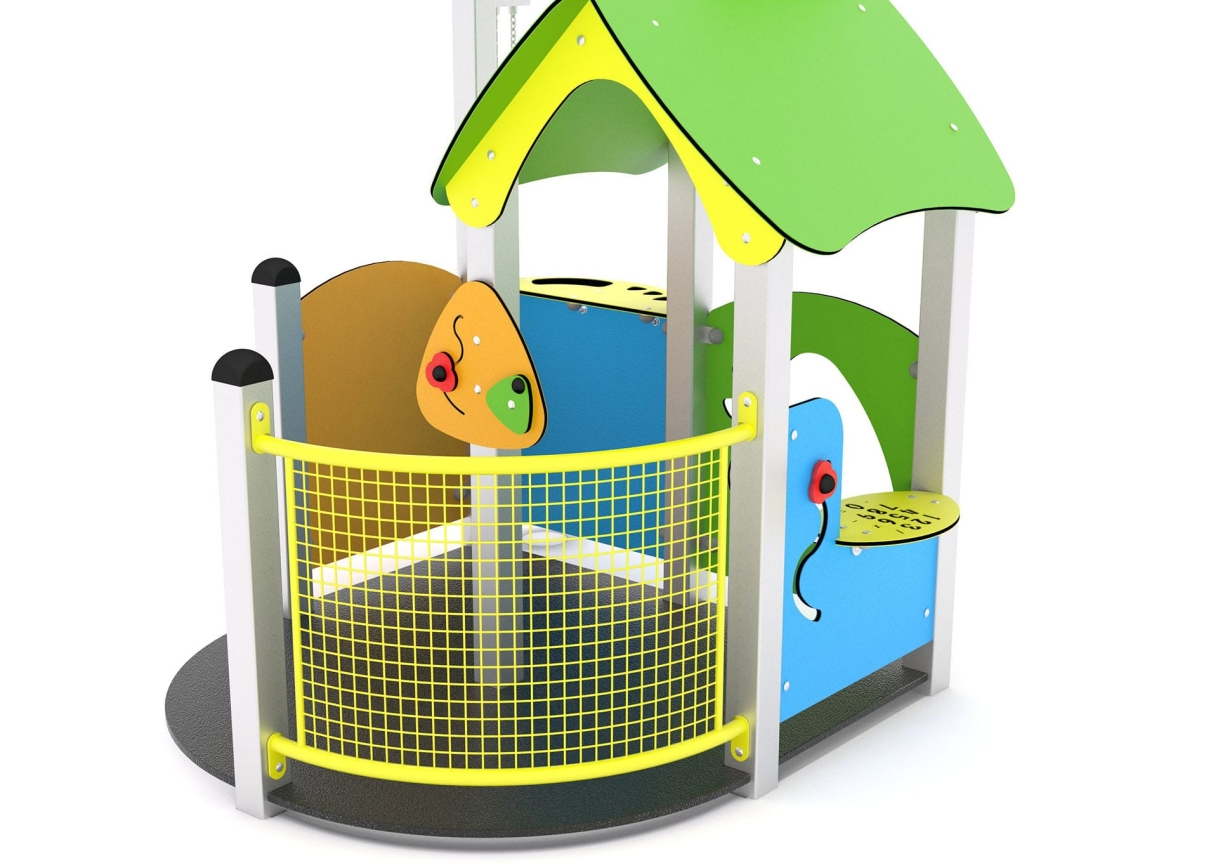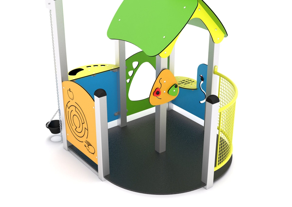 This multiplay playhouse is packed with activities for younger years. With maze play panel, bucket and chain pully system, moving shapes, kiosk space and crawl through panel.