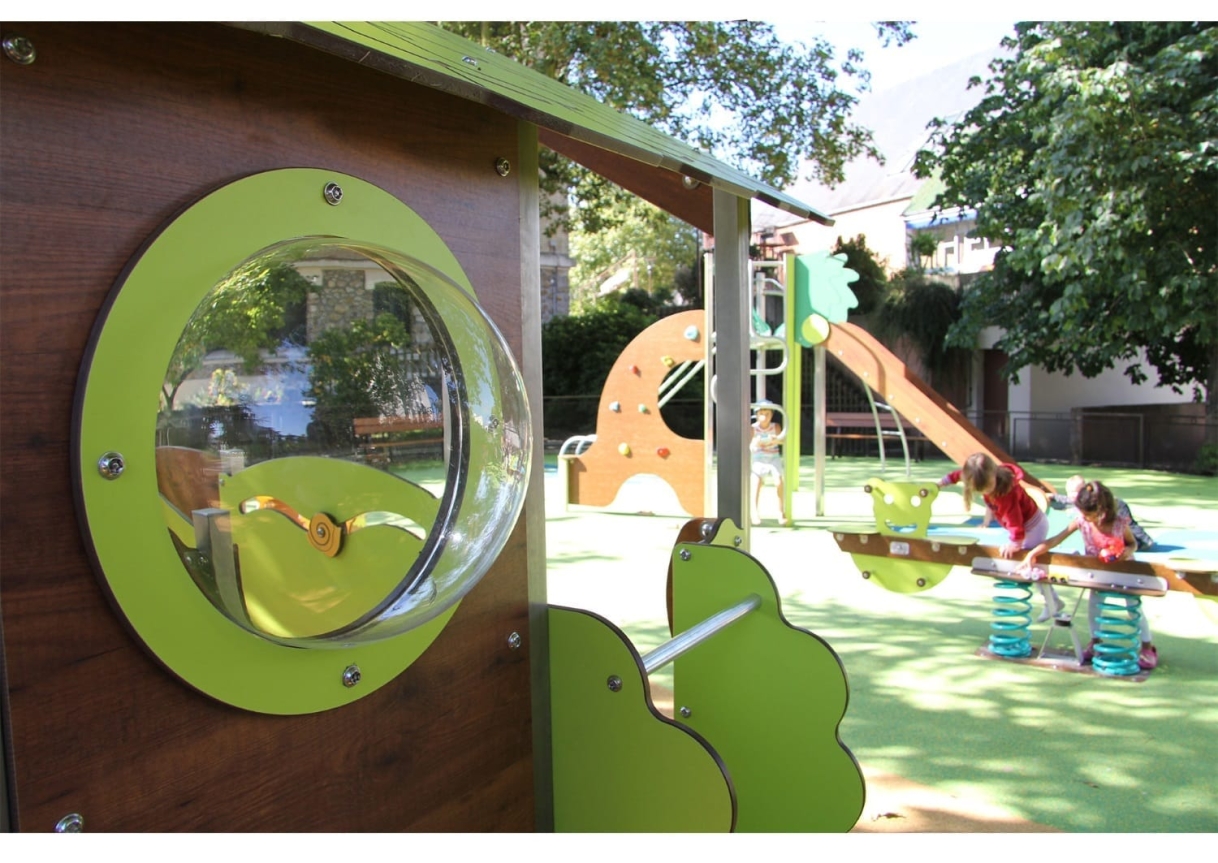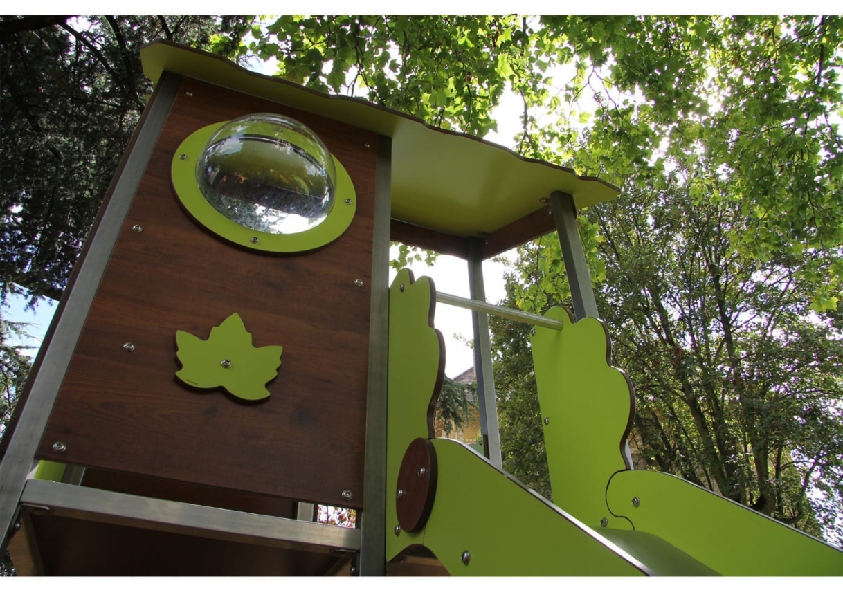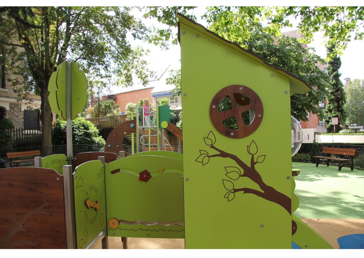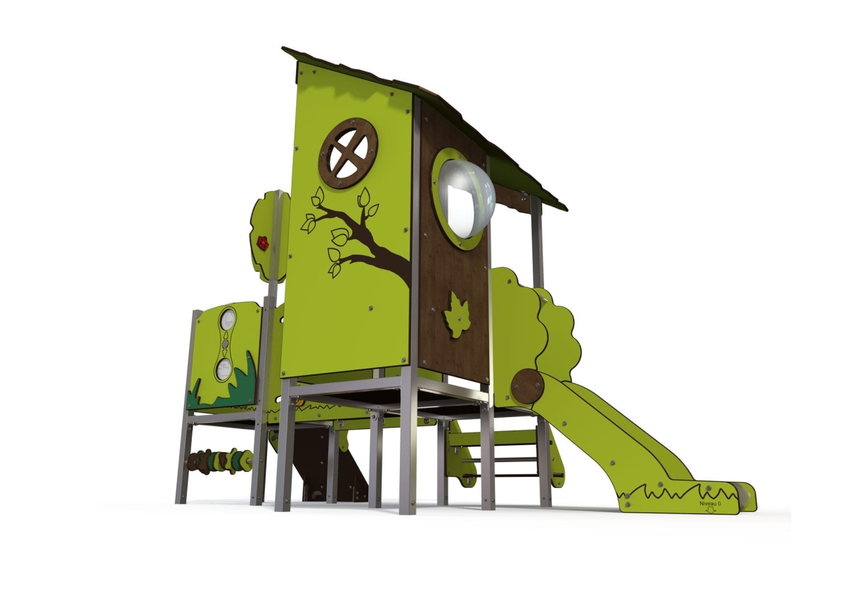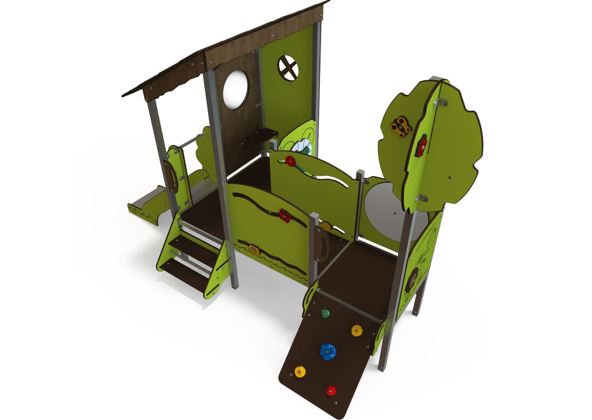 Our lovely nature playhouses are perfect for all locations. This playhouse features a slide, mini bridge, stairs, play panels and climb wall ramp.