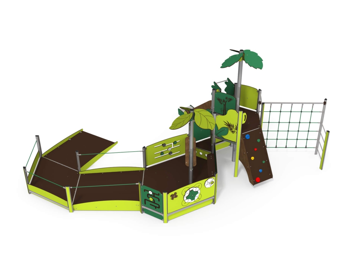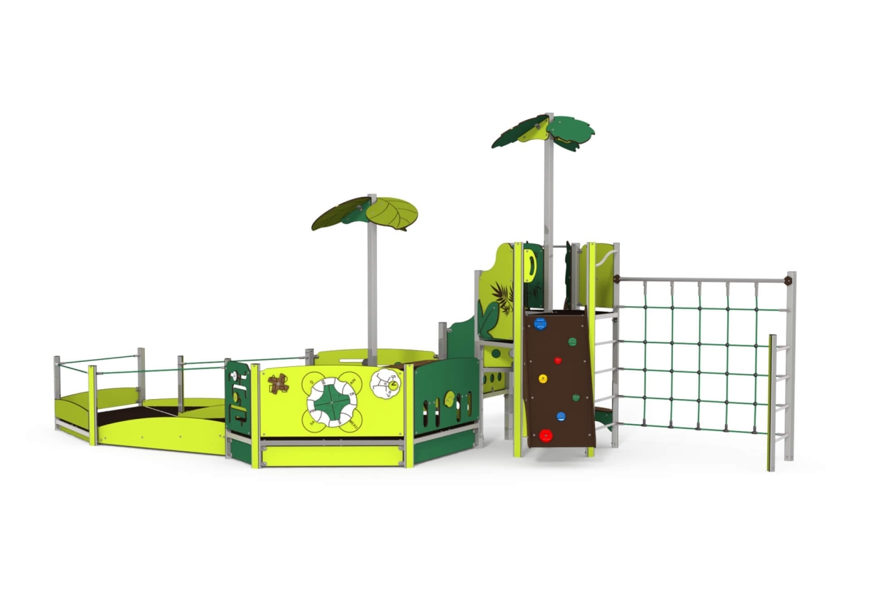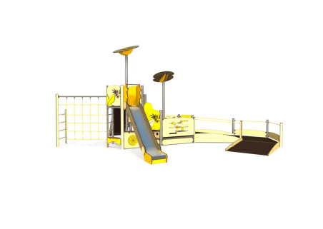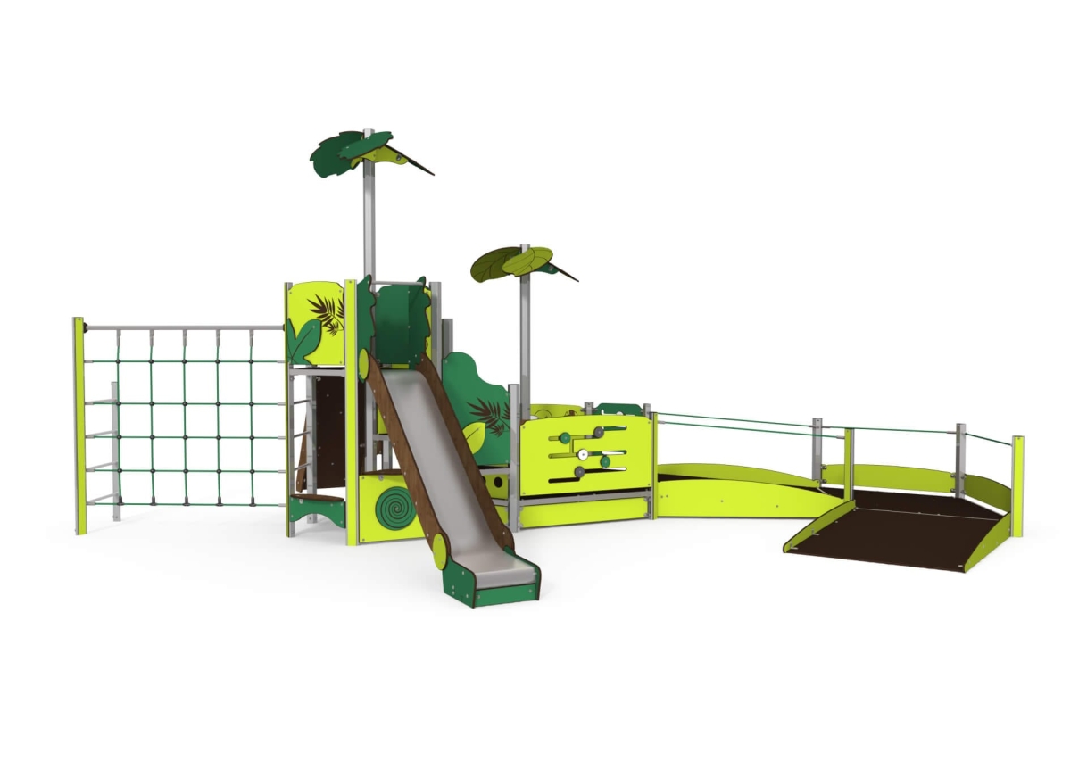 A large inclusive multiplay unit with play panels, climb net, climb wall, slide, platforms and sheltered seating. A wheelchair friendly ramp allows access to the play unit to allow inclusive play.