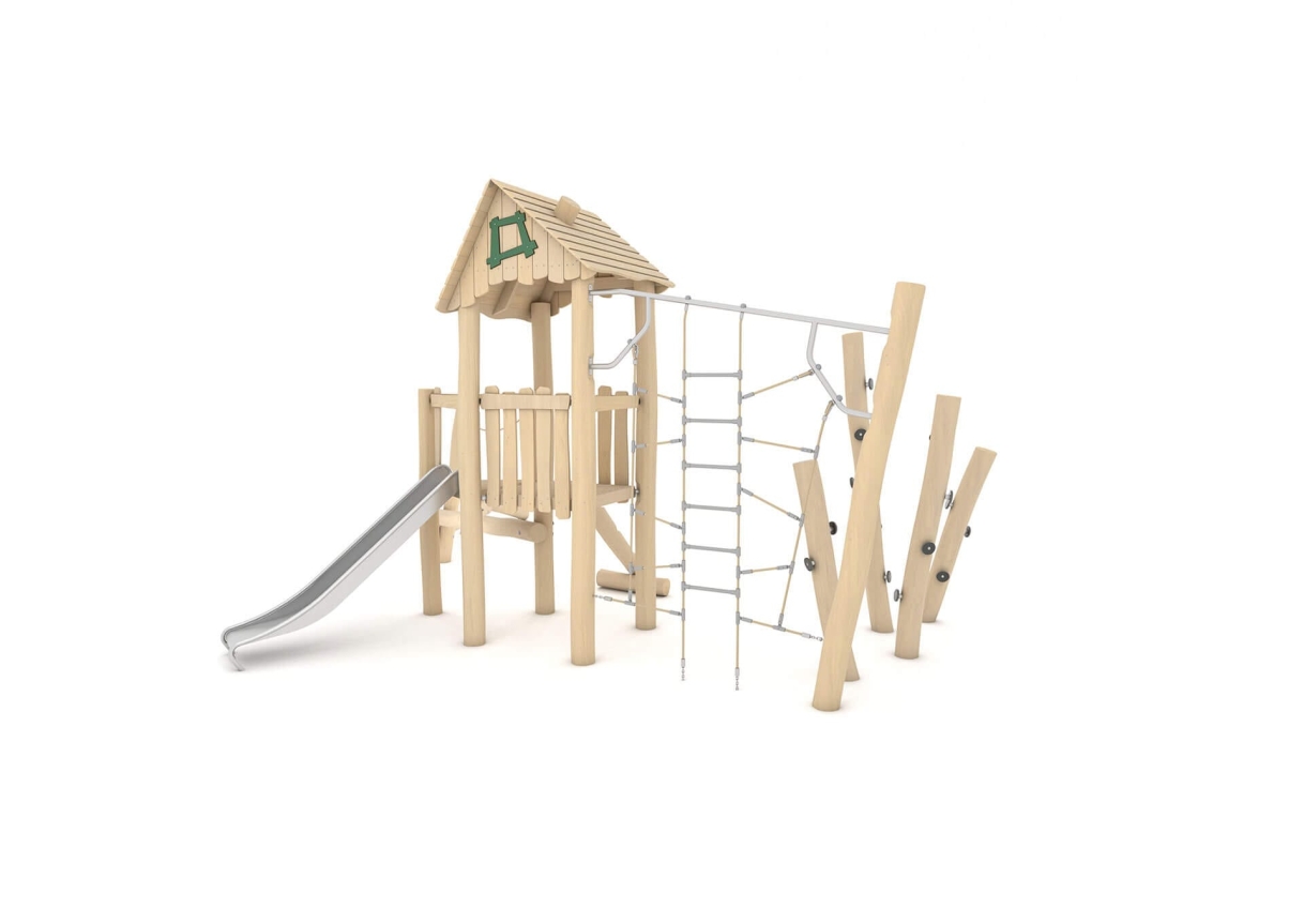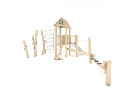 A great larger multiplay unit for a junior age group. Featuring climb nets, climbing posts, balance beams, log climber and slide. Fun for physical and social development.