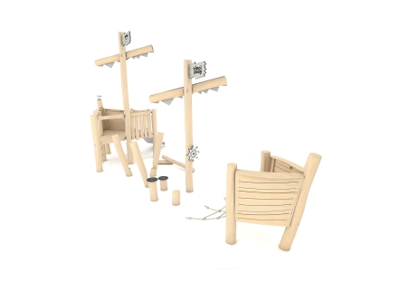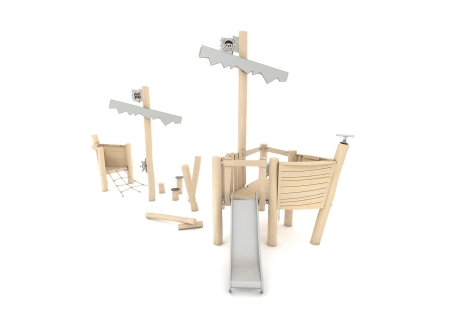 A great medium sized Robinia pirate ship for the playground. With slide, 2 x ships wheel, telescope, balance beams and pods, stepping logs and a climbing net with two platforms. Great for children to explore and play in a non-prescriptive environment.
