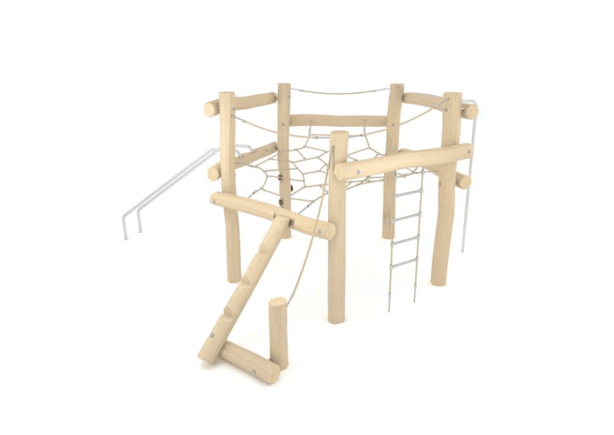 With climbing log, central spider net, sliding pole, rope ladder and angled pull up bar.