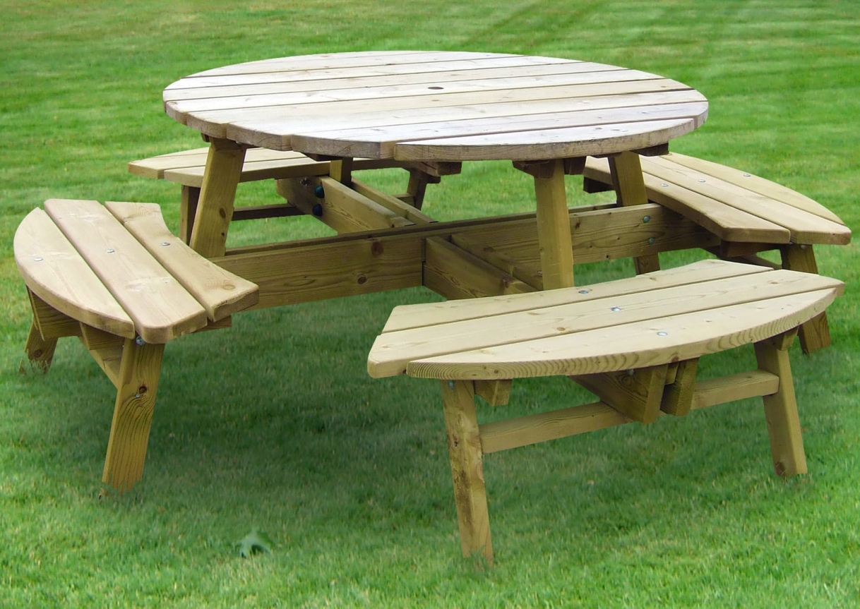 A large 8 seat timber picnic table with 1.35m diameter. Perfect for any environment.