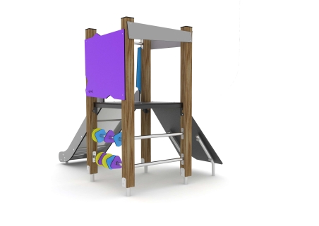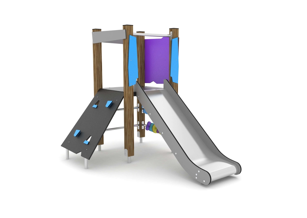 A great option for a smaller play unit packed with play value! With slide, mini climb wall, spinning shapes and two rung ladder. A wonderful challenge for all age groups.