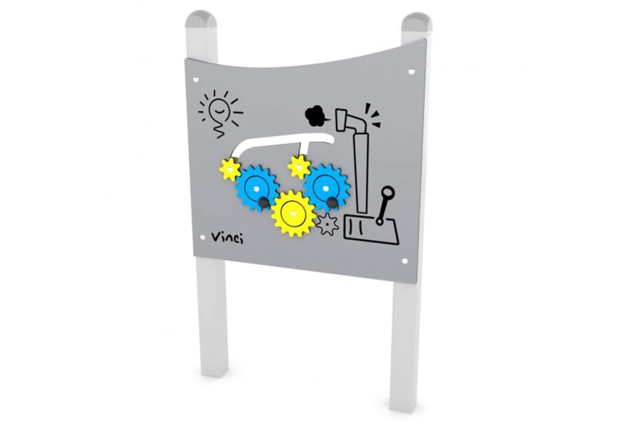 This play panel features cogs that move and turn for learning fun.
