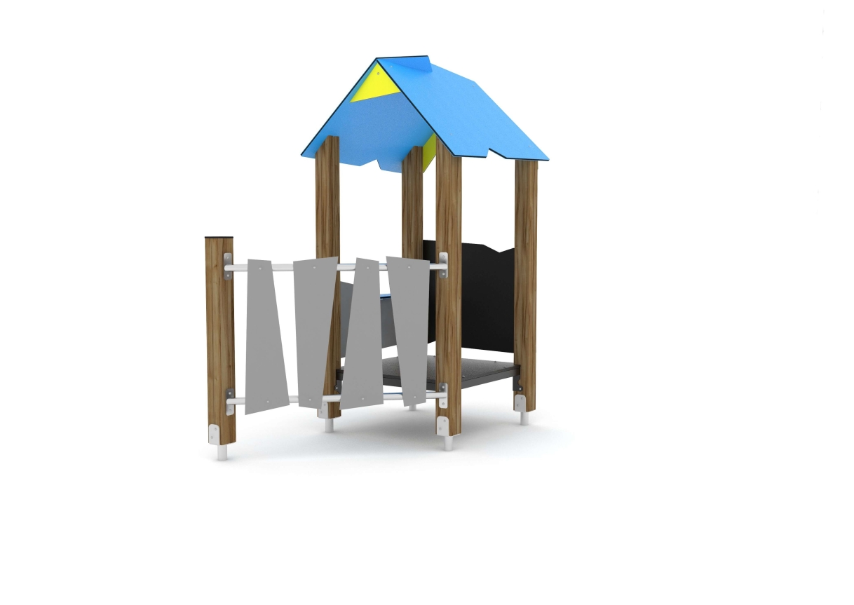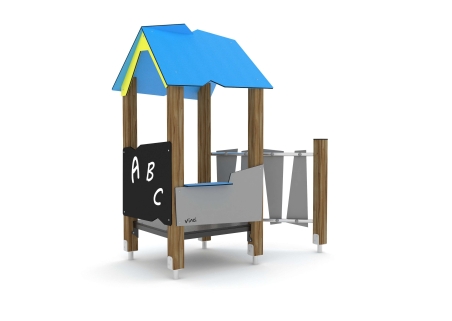A great timber playhouse with low level platform, roof and chalkboard and kiosk play space. Perfect for little ones to explore and play.