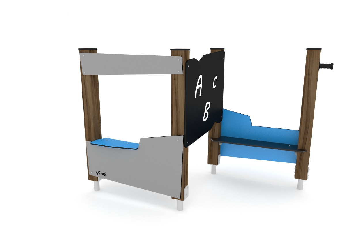 A fun triple play panel. With one chalkboard panel,, one kiosk play space and one bench. This unit is also great for those users with mobility issues as there are supportive hand hold bars around the unit.
