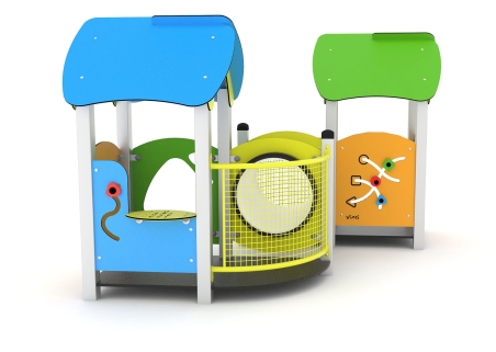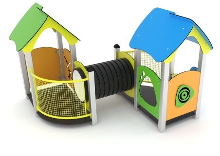 The Tunnel Playhouse has two playhouses, connected by a tunnel with play panels and kiosk space.