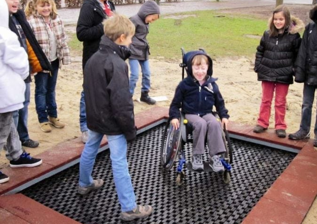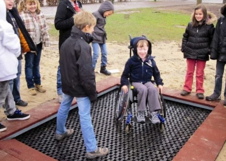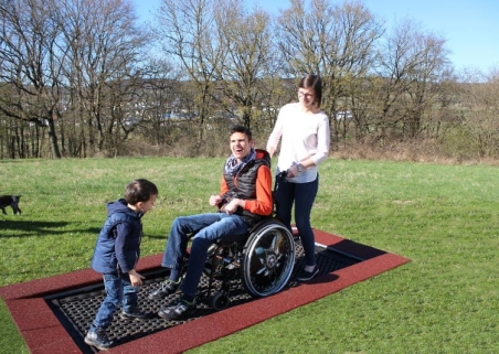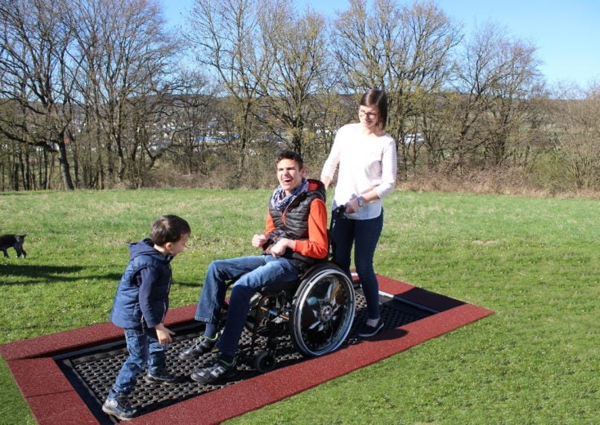 Being active is good for you—especially for people with limited mobility . Our wheelchair Trampoline is suitable for wheelchair users: sloping edge panels enable the surface level trampoline to be accessed safely and easily. The flexible trampoline surface allows gentle rocking and suspension regardless of the person’s weight. Because of the compact dimensions, an accompanying person can stand in direct contact with the wheelchair user, which is important for example for people with severe disabilities.