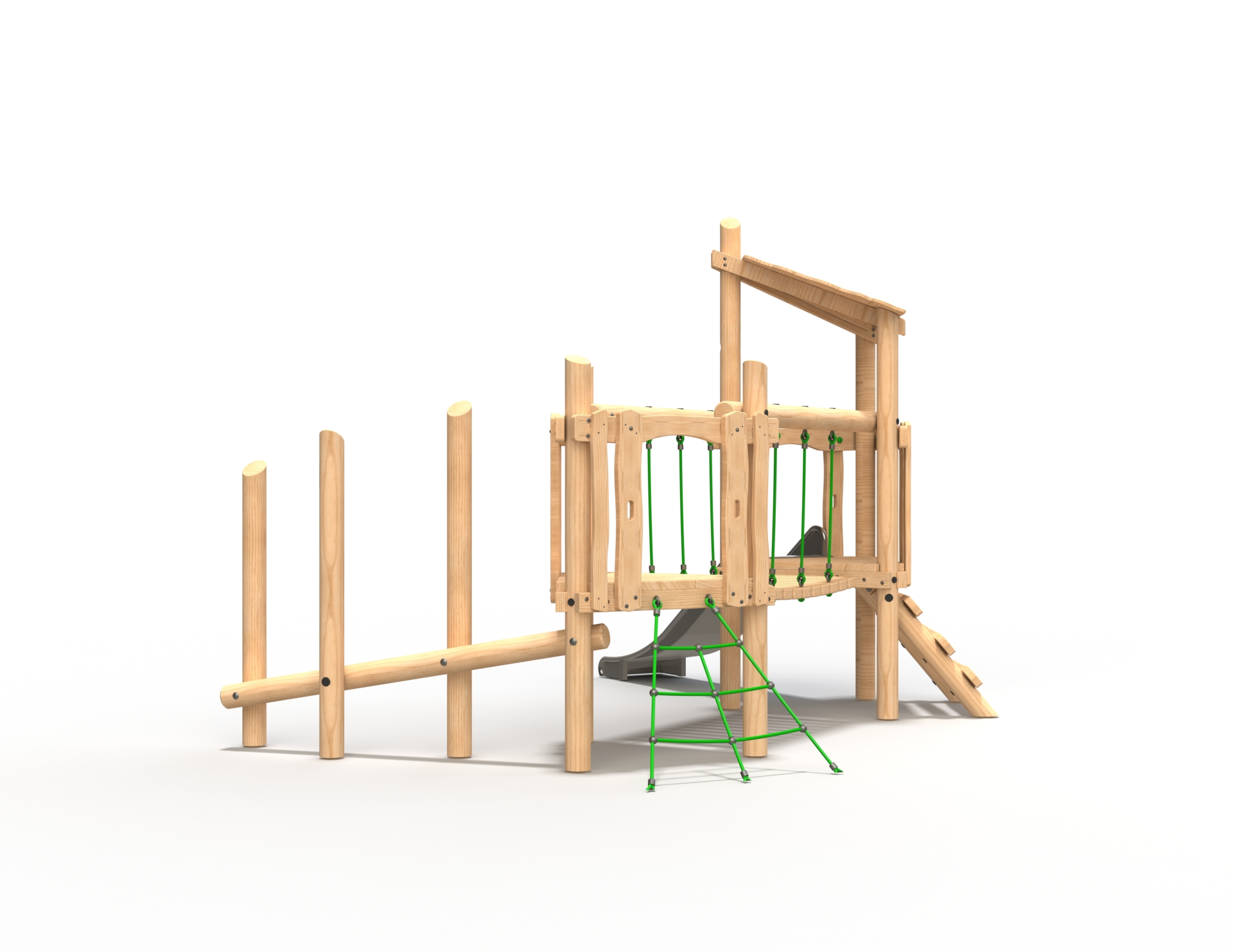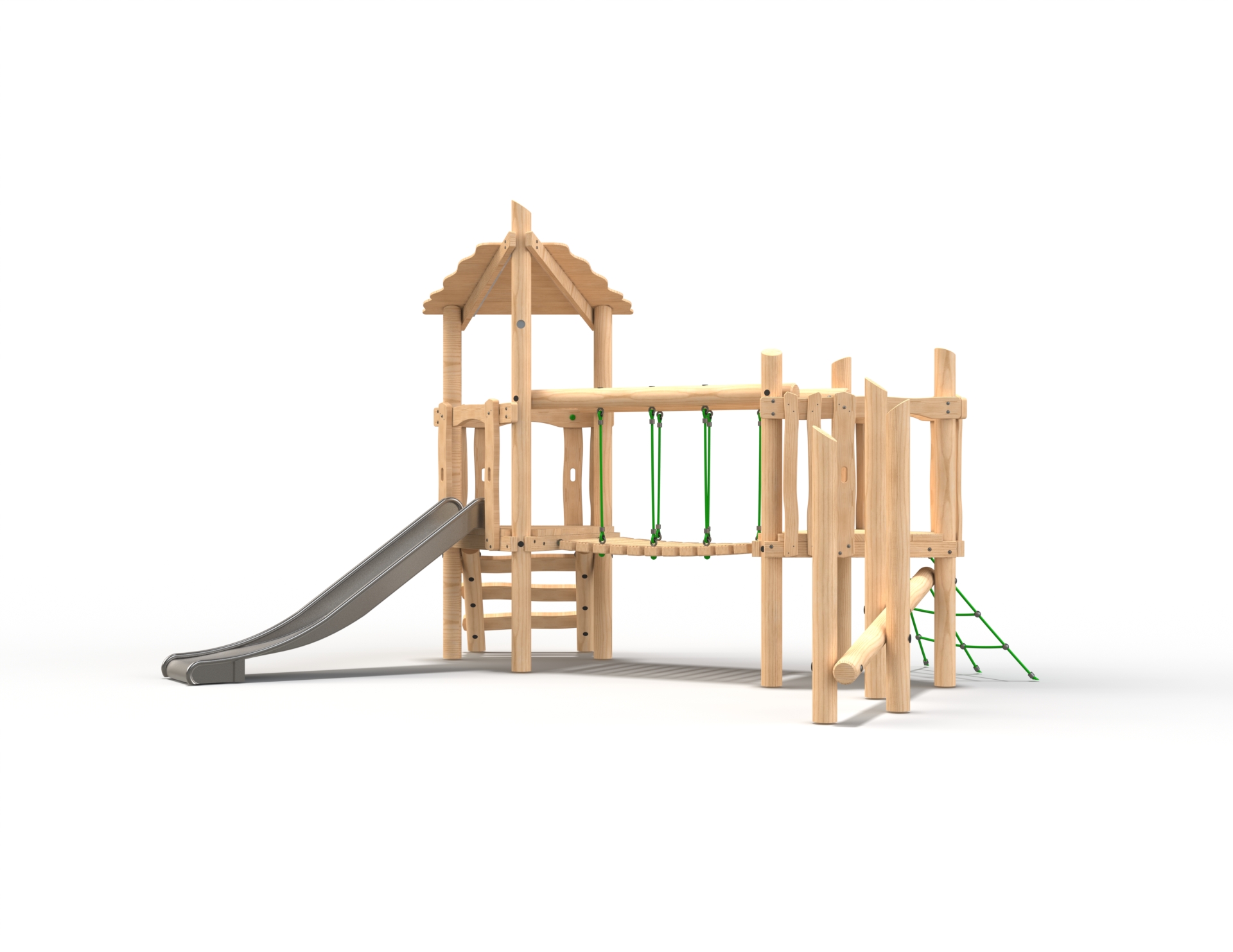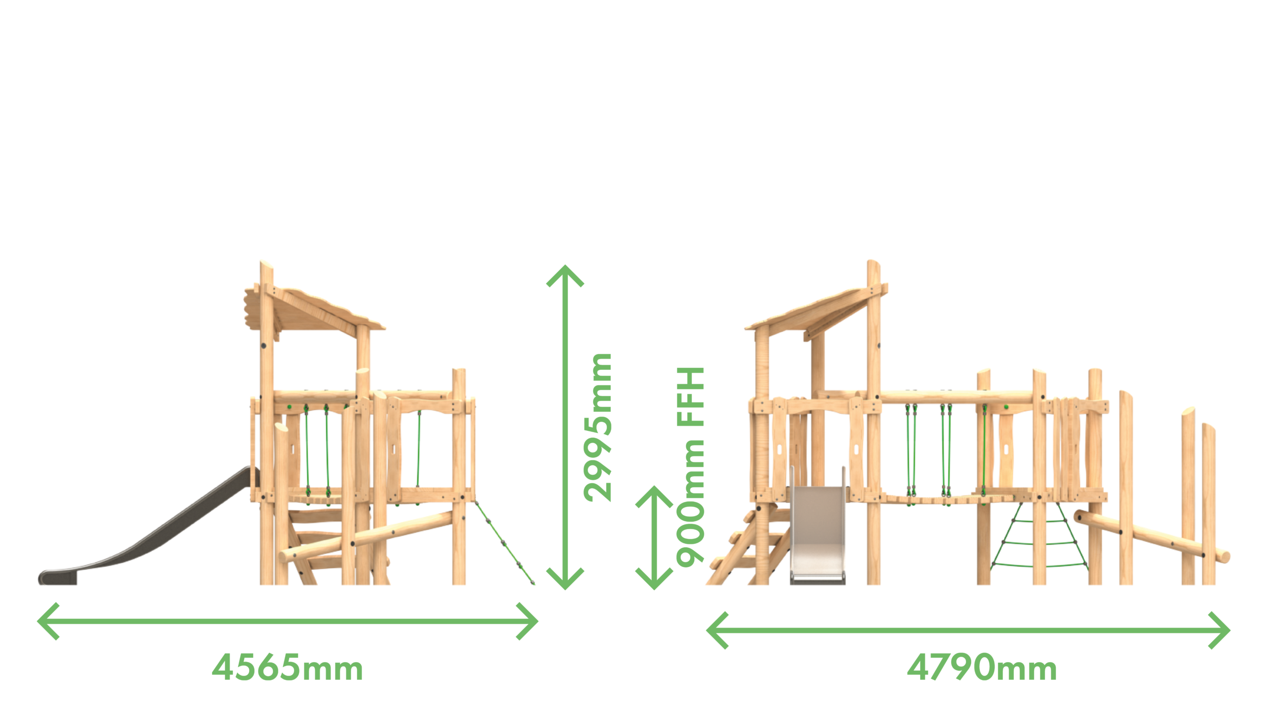 Double-deck timber multiplay tower measuring 4565mm by 4790mm with a height of 2995mm and 900mm free fall height. Includes climbing features, slide, and areas for social and imaginative play. Requires a safety surface area of 41.17m² (8384mm x 8035mm), offering varied play opportunities for children.