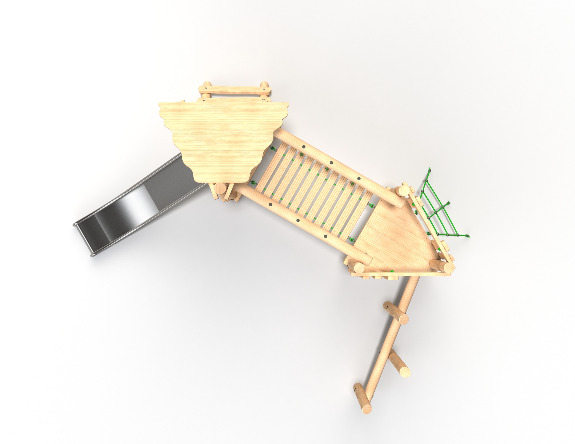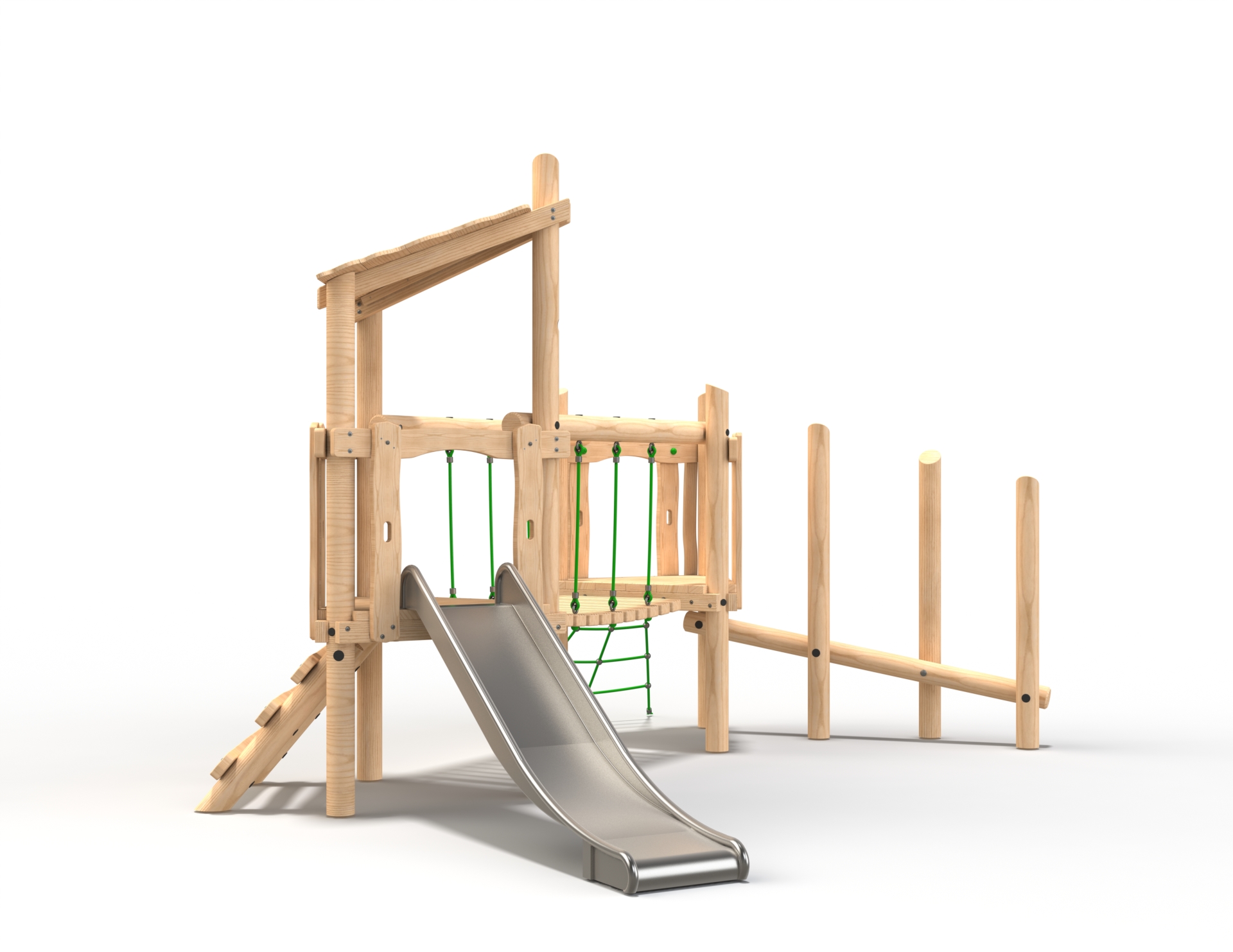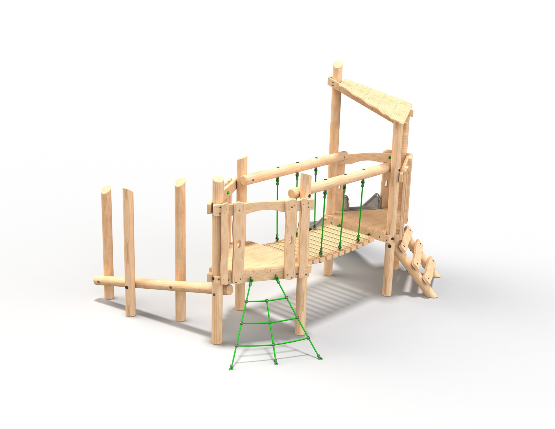 Double-deck timber multiplay tower measuring 4565mm by 4790mm with a height of 2995mm and 900mm free fall height. Includes climbing features, slide, and areas for social and imaginative play. Requires a safety surface area of 41.17m² (8384mm x 8035mm), offering varied play opportunities for children.