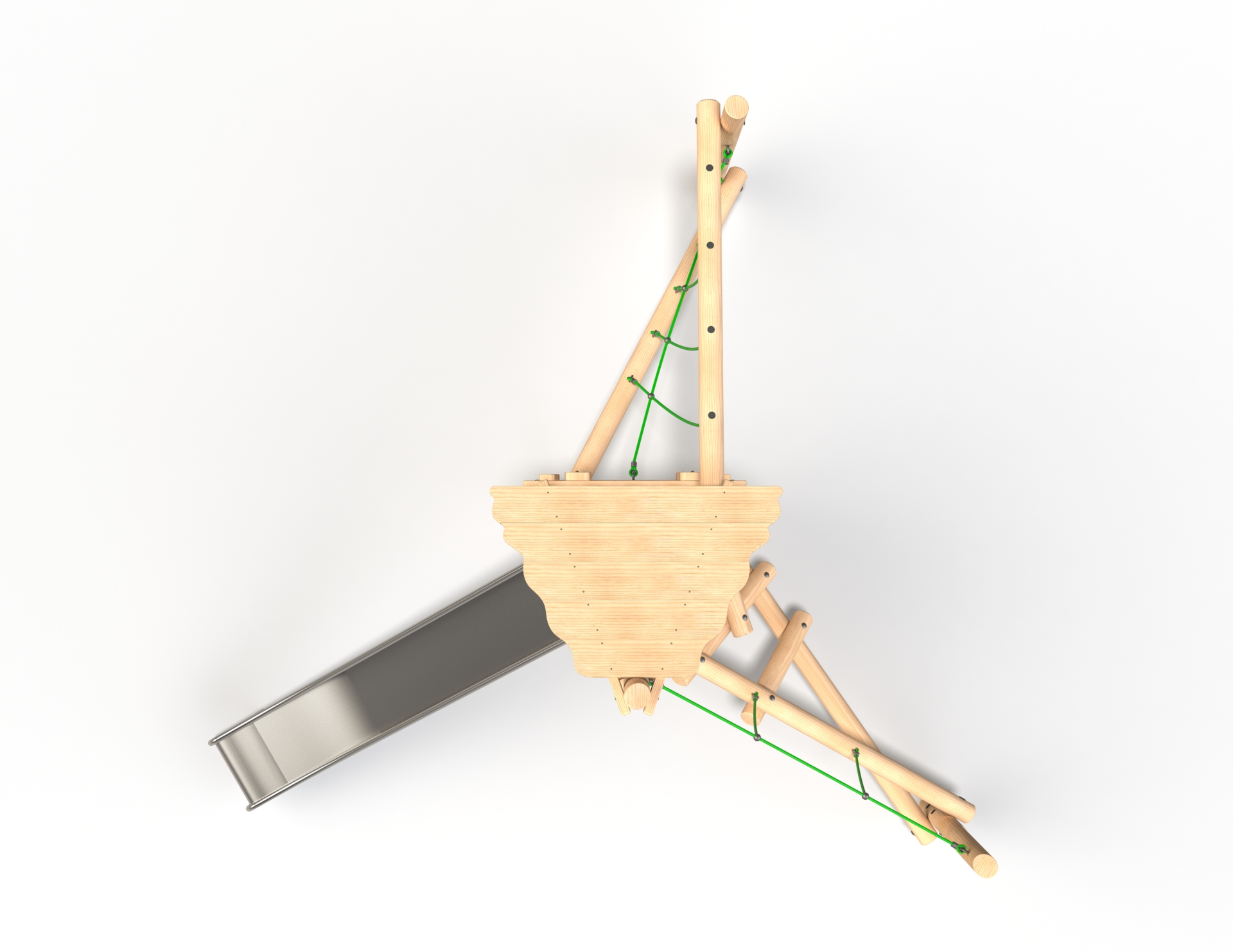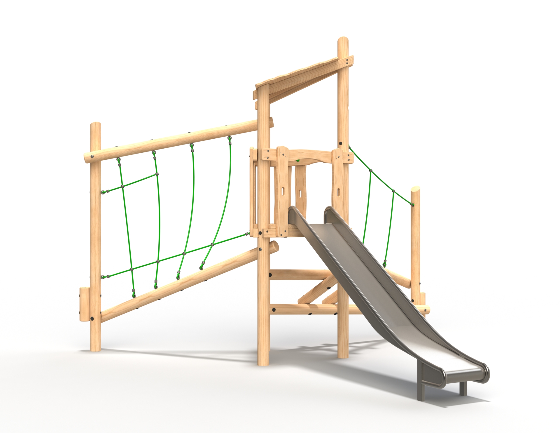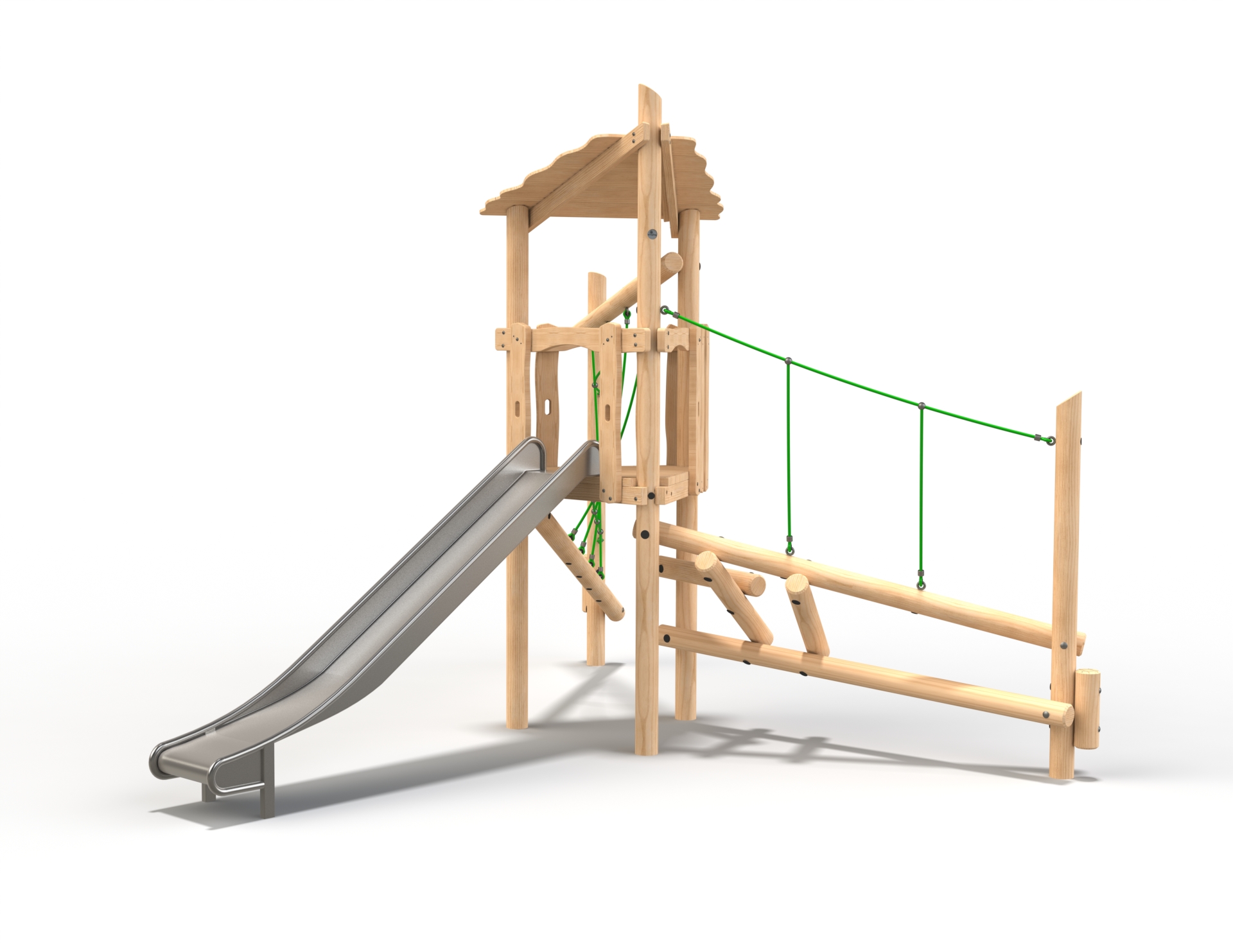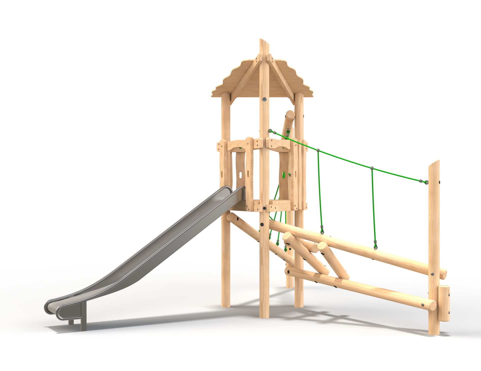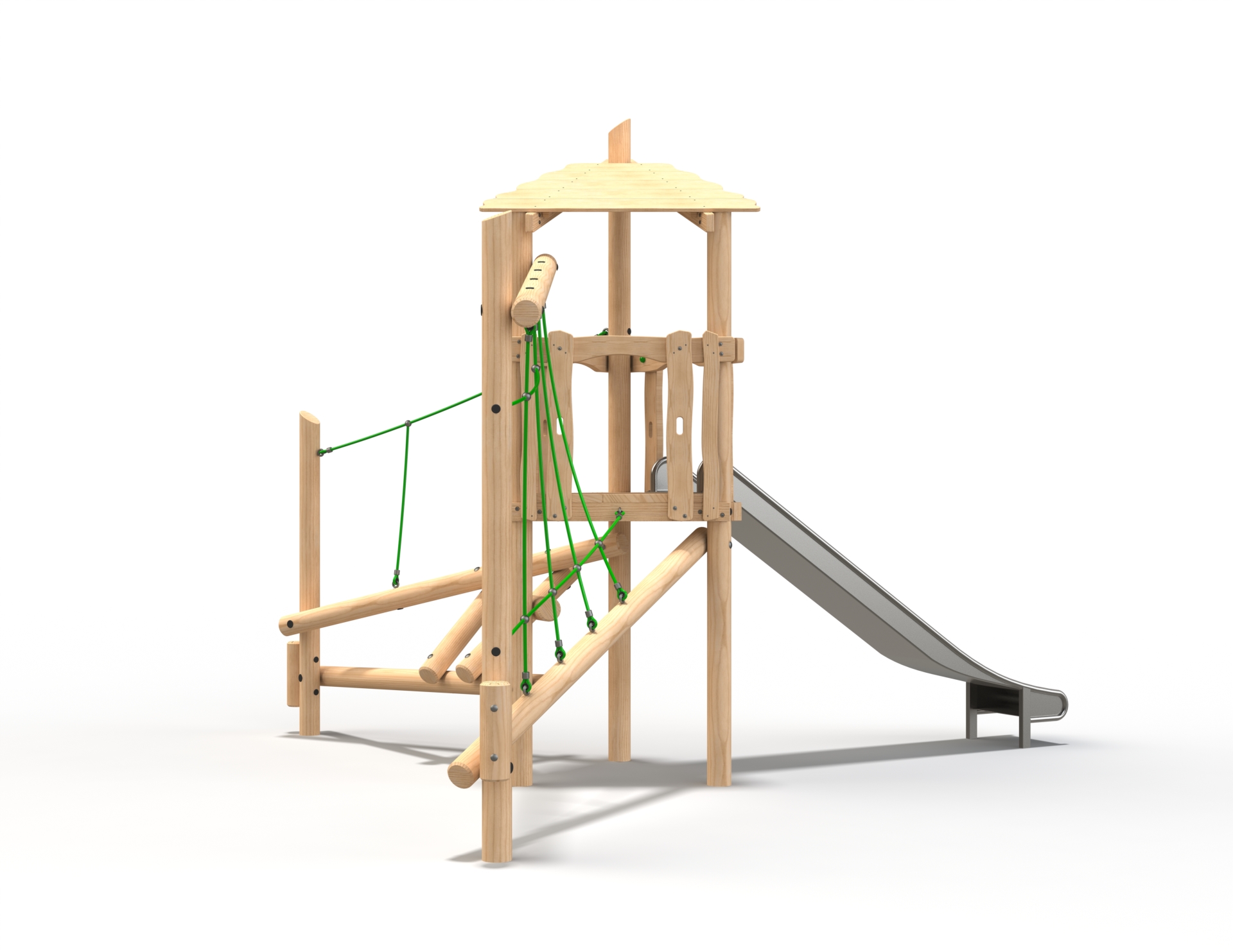 The Alpine Tower – Single Deck Unit 2 is a single-deck timber tower measuring 4709mm by 4509mm with a height of 3595mm and a free fall height of 1500mm. It offers climbing, balance, overhead and imaginative play opportunities, supporting social interaction. The safety surface area covers 37.28m², ensuring safe play within an 8284mm by 7691mm zone.