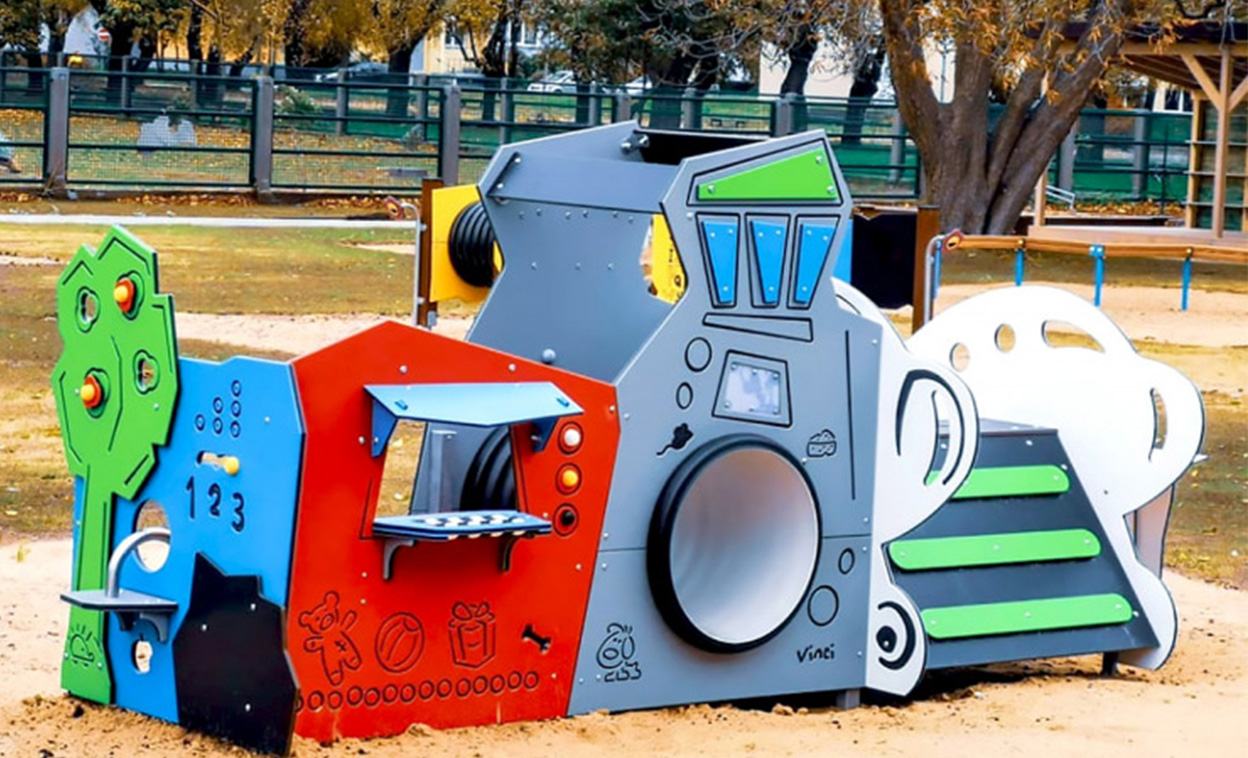 This fun airport play unit features an aeroplane slide, table and chair,shop window and a tunnel. An exciting themed play to add to the playground.