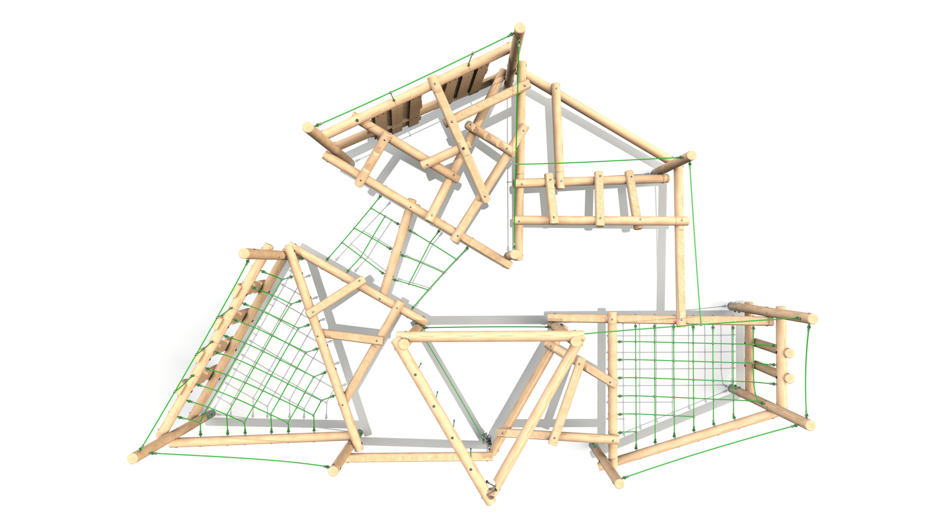 Using a combination of Timber and Rope, the Clamber Stacks have been designed to replicate a natural pile of sticks. This equipment is not only challenging but also offers an enjoyable play environment.Clamber Stack Madrina with, nets, ropes and climb walls.