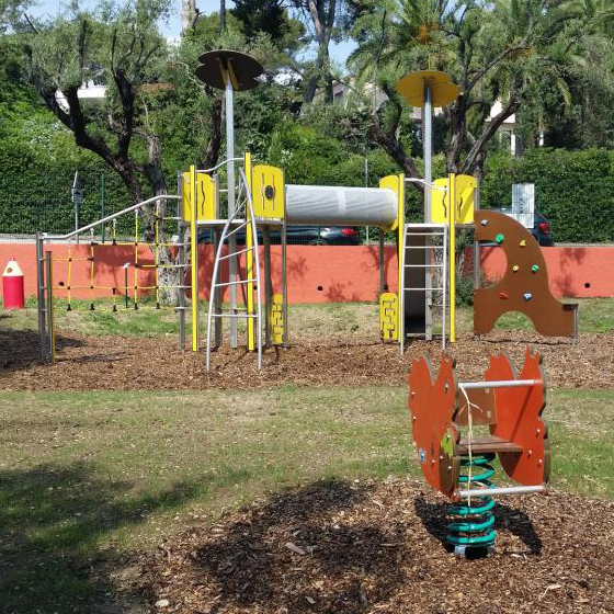This two platform multiplay unit includes a traditional slide, large crawl tunnel, banister slide, climbing net and curved ladders. Play panels and seating beneath the platforms help support interaction between younger and older children within the playground environment.