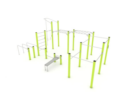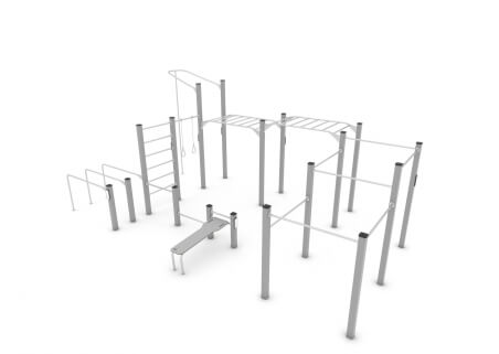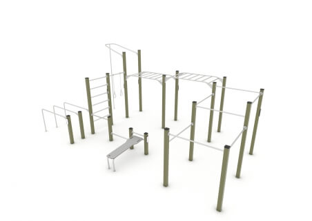 With 8 variations of exercise, this full body workout multi outdoor gym is the perfect addition to any calisthenics street workout space. Complete with human flag pole, chest dip bars, multi level push up bars, oblique crunch bench, push ups with leg raise bar, ring pull up area, monkey bars and pull up bars.