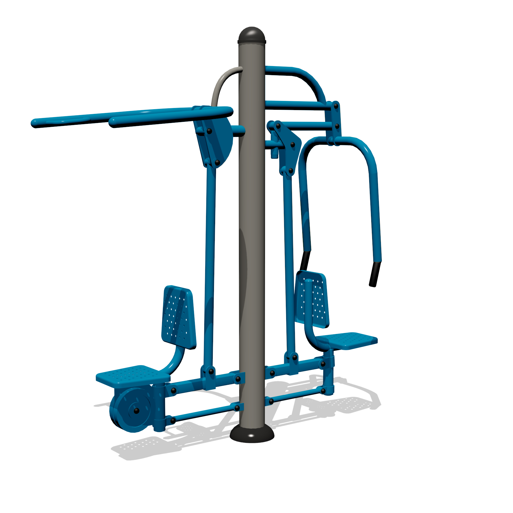 This outdoor gym unit offers two different workouts in one machine. The Lat Pull side focuses on developing the shoulders and the triceps. The Chest press provides an upper body workout focusing on the chest and arms, and will develop and strengthen the muscles.
