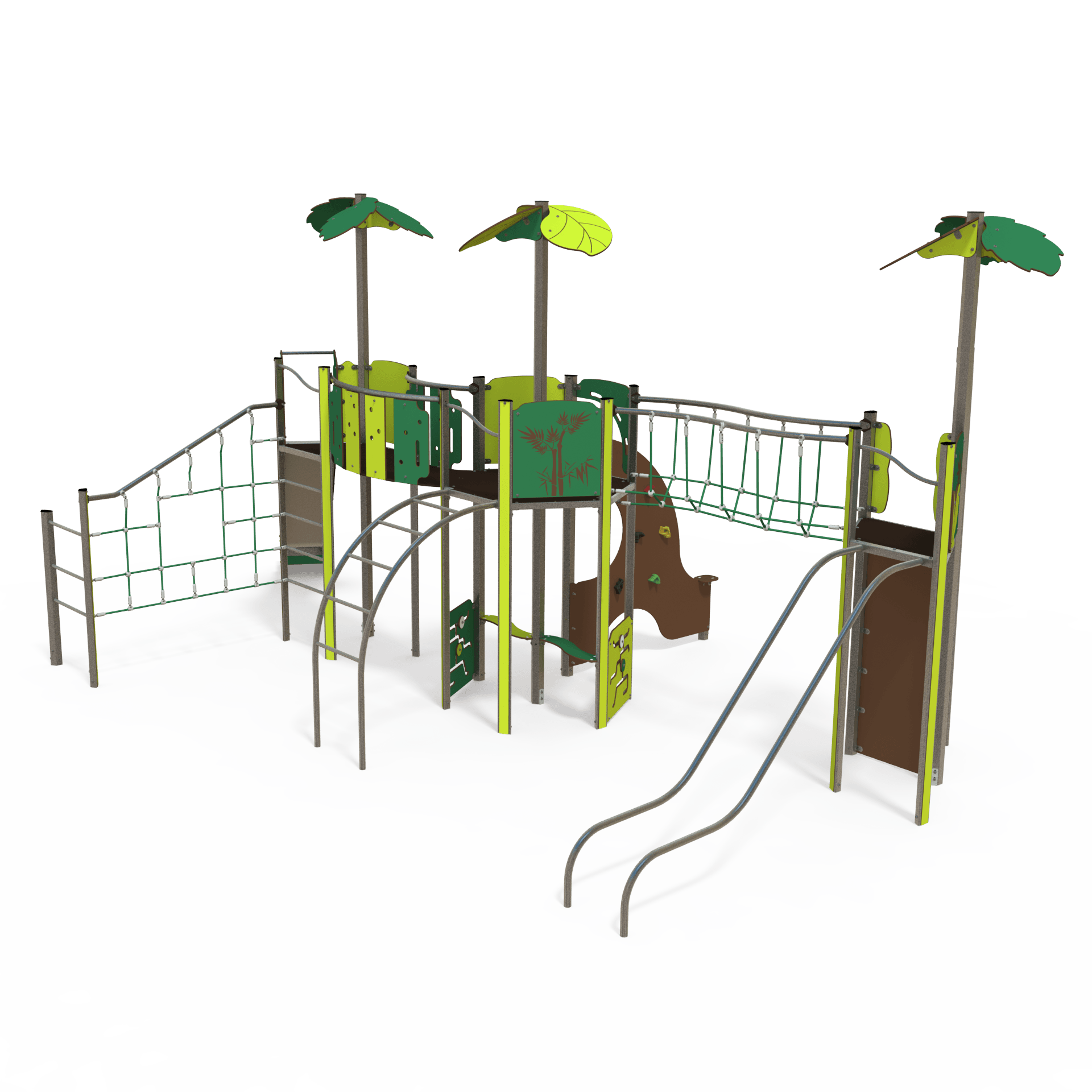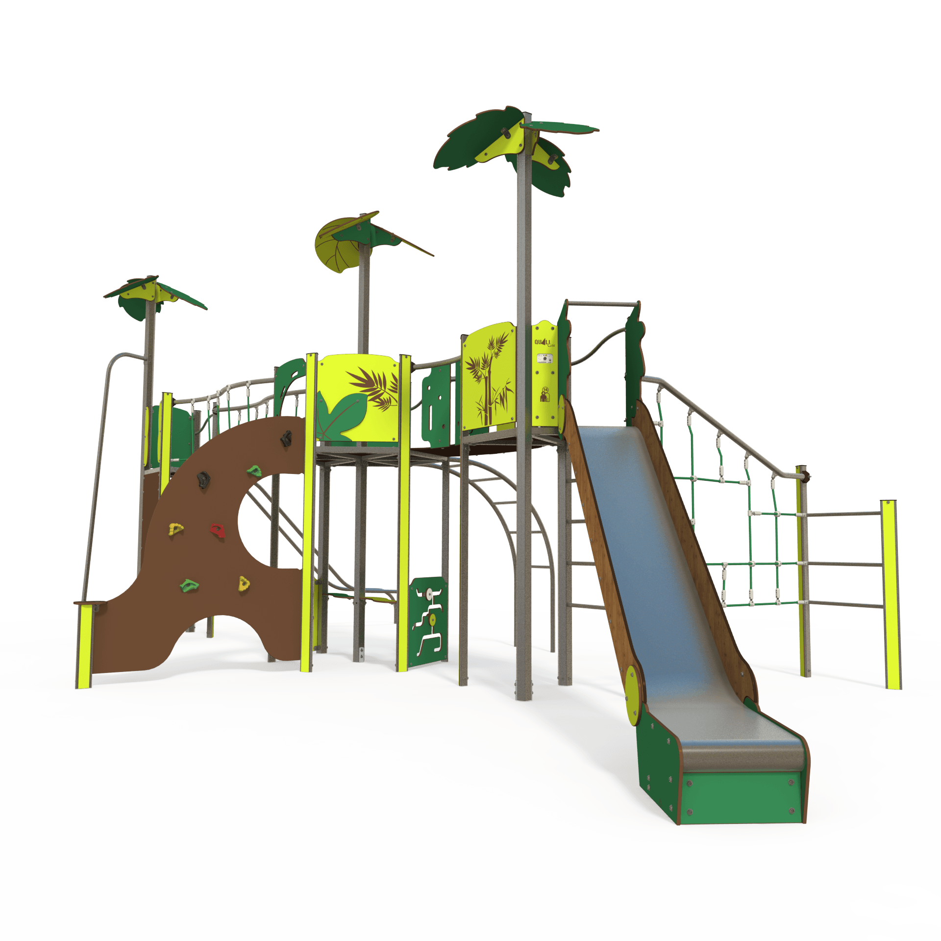 The ME 18-3004 mega steel multiplay unit offers multiple activity zones including slides, climbing walls, and rope features. Suitable for ages 3–14, it encourages active play and physical development in a durable steel structure.