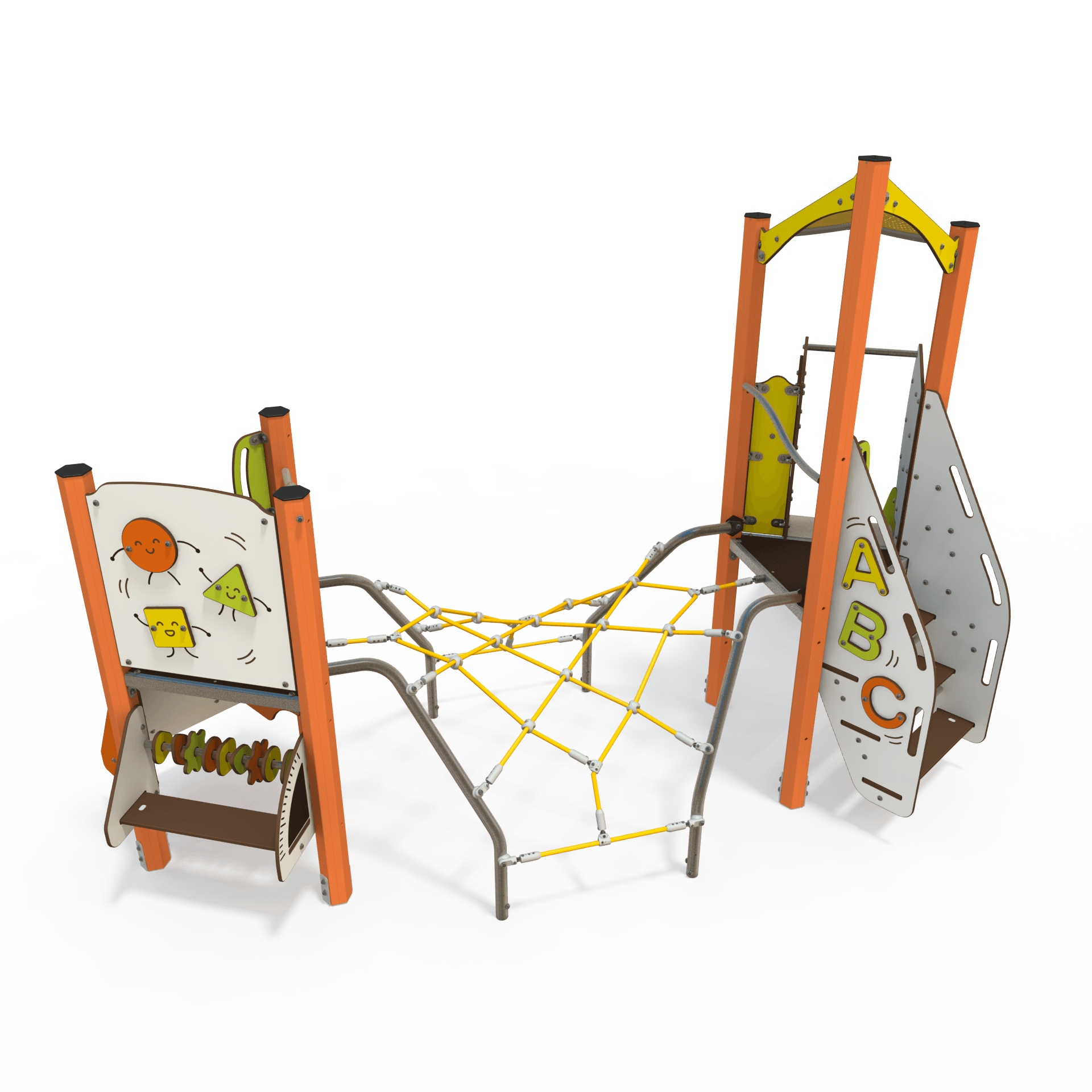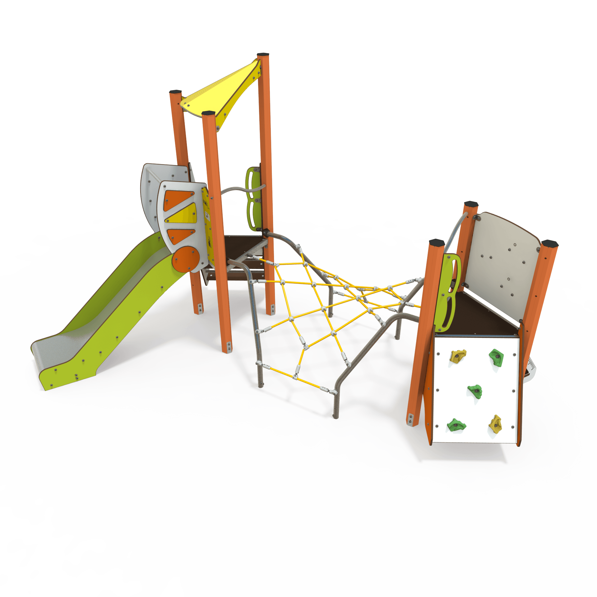 The MI 09-2092 mini steel multiplay unit is designed for children aged 2–6 years. It features slides, climbing panels, and activity decks to encourage active play and development in a compact, durable structure.