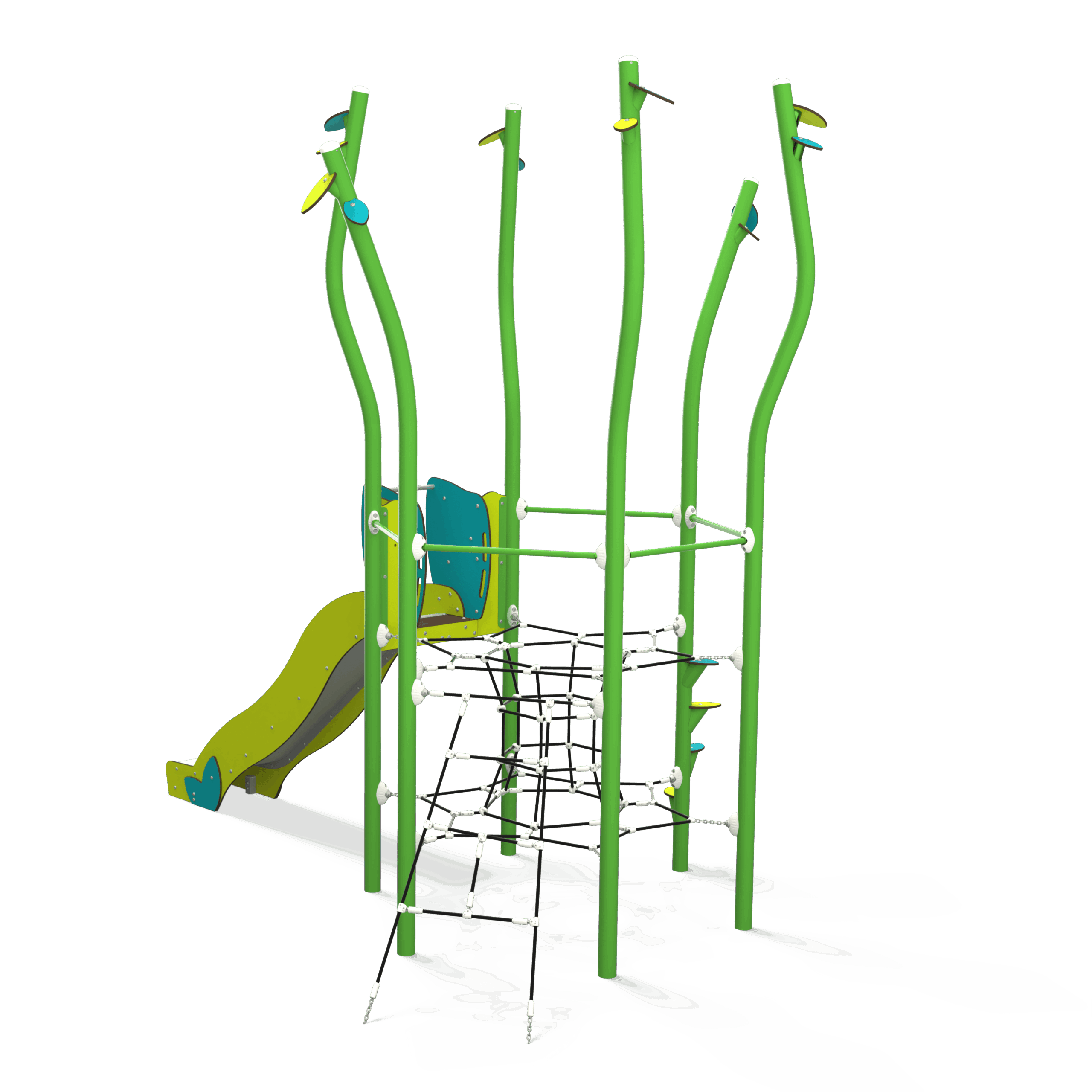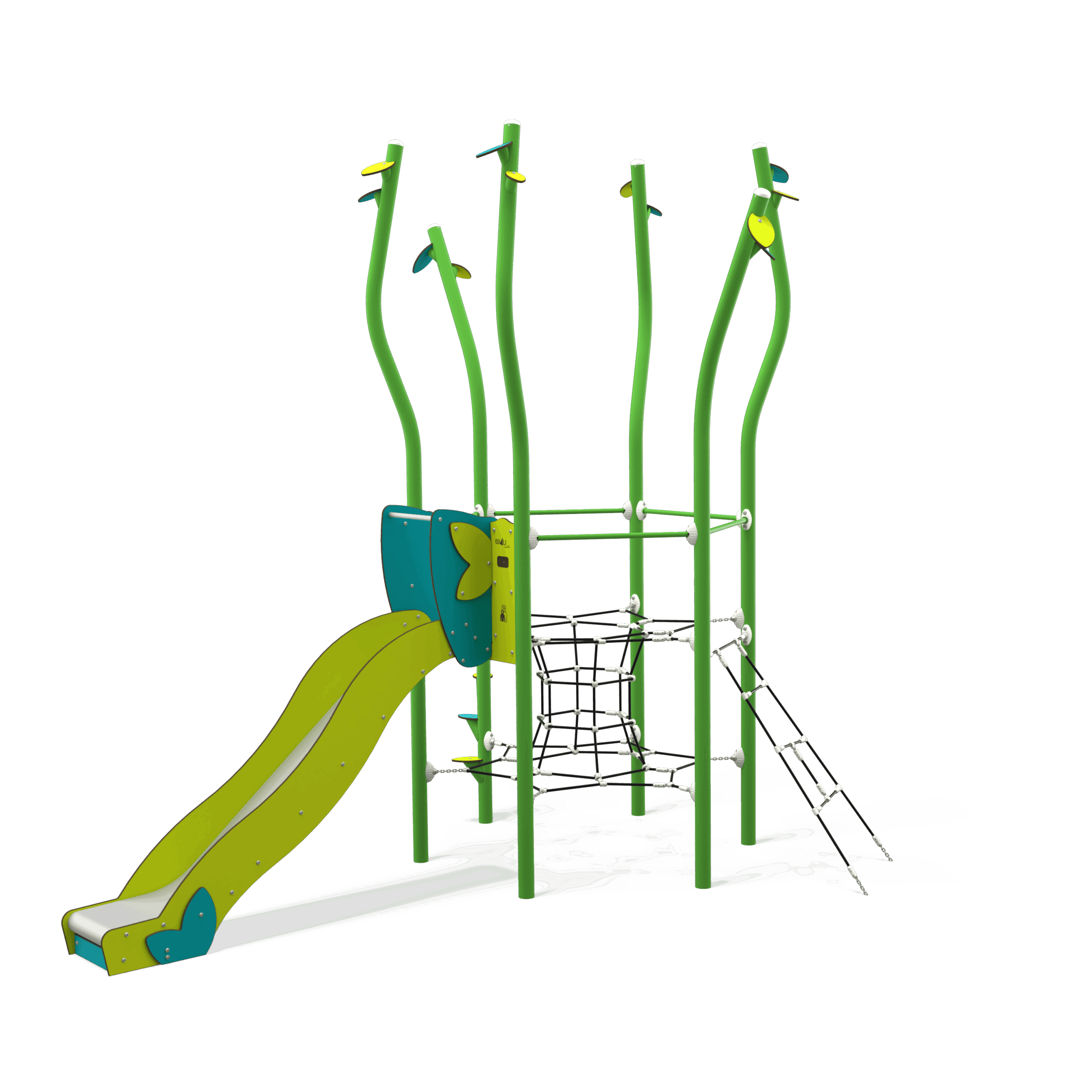 NA 15-0002-AF24 is a nature-inspired steel multiplay unit from the Natura range by Quali-Cité. Designed for children aged 4–14 years, it features organic shapes, tree-trunk posts, and natural-finish panels. Built from galvanised steel to EN1176 standards. Contact Caloo UK for pricing and installation details.