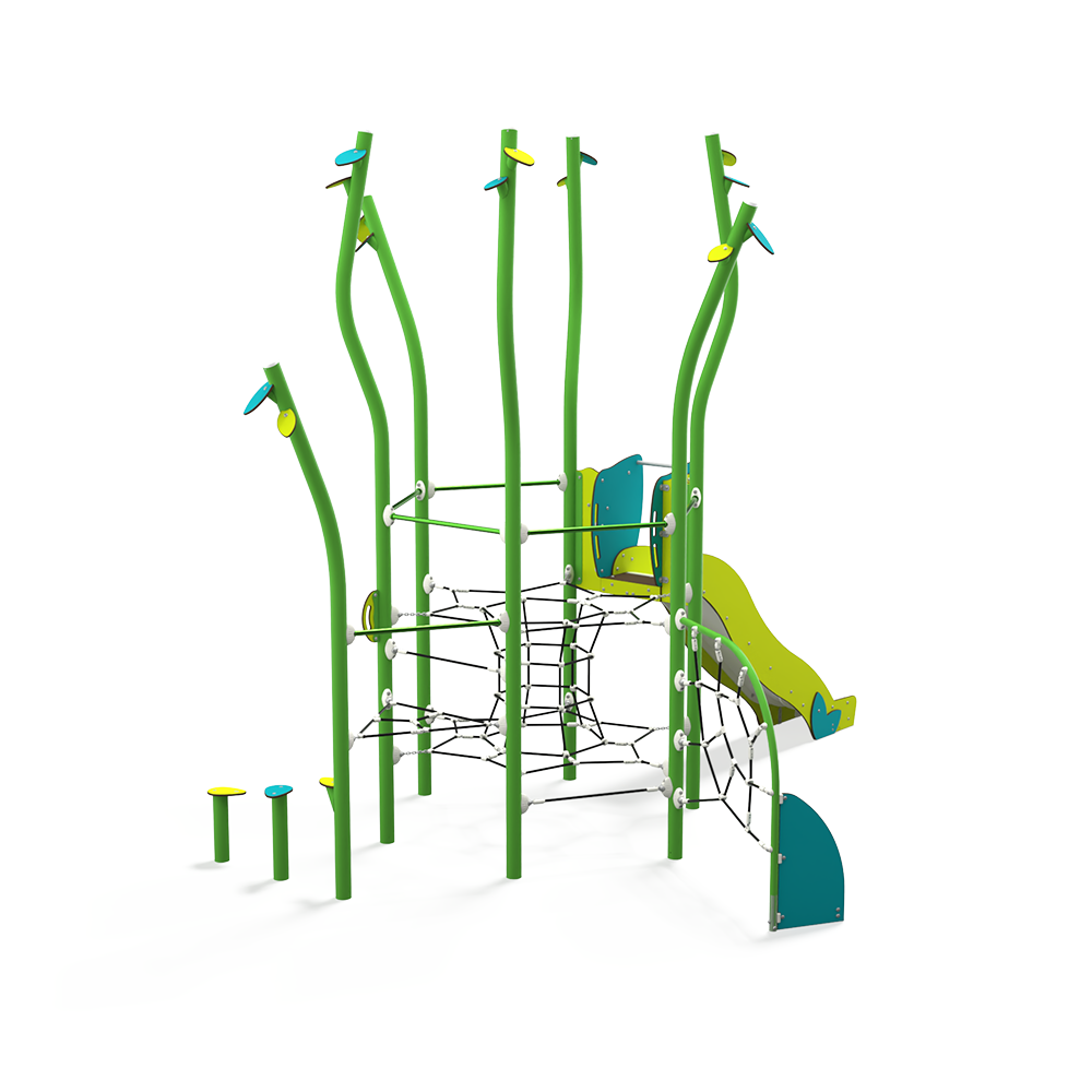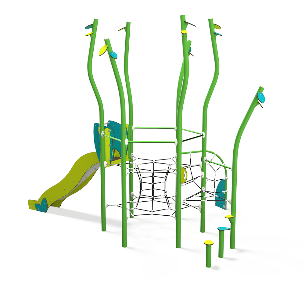 NA 15-0004-AF24 is a nature-inspired steel multiplay unit from the Natura range by Quali-Cité. Designed for children aged 4–14 years, it features organic shapes, tree-trunk posts, and natural-finish panels. Built from galvanised steel to EN1176 standards. Contact Caloo UK for pricing and installation details.