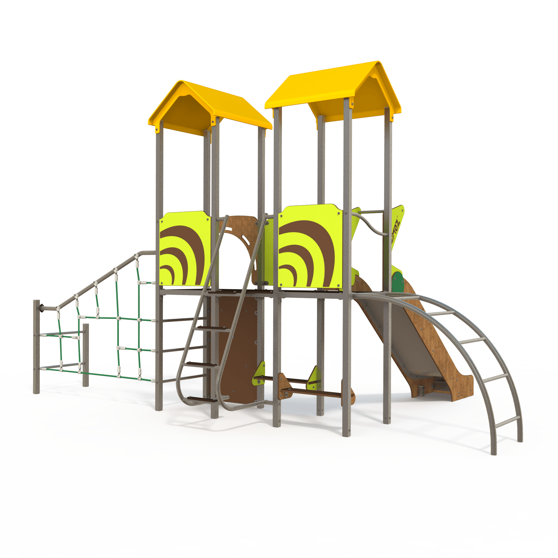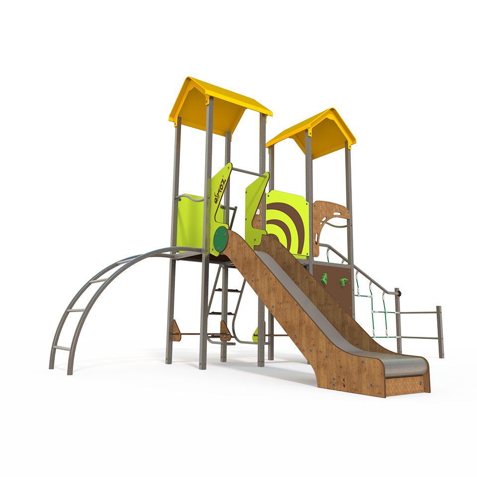 The OS 12-2003 Osmoz steel multiplay unit offers themed panels, slides, and climbing activities. Designed for children aged 3–12 years, it encourages active play and social interaction in outdoor spaces.