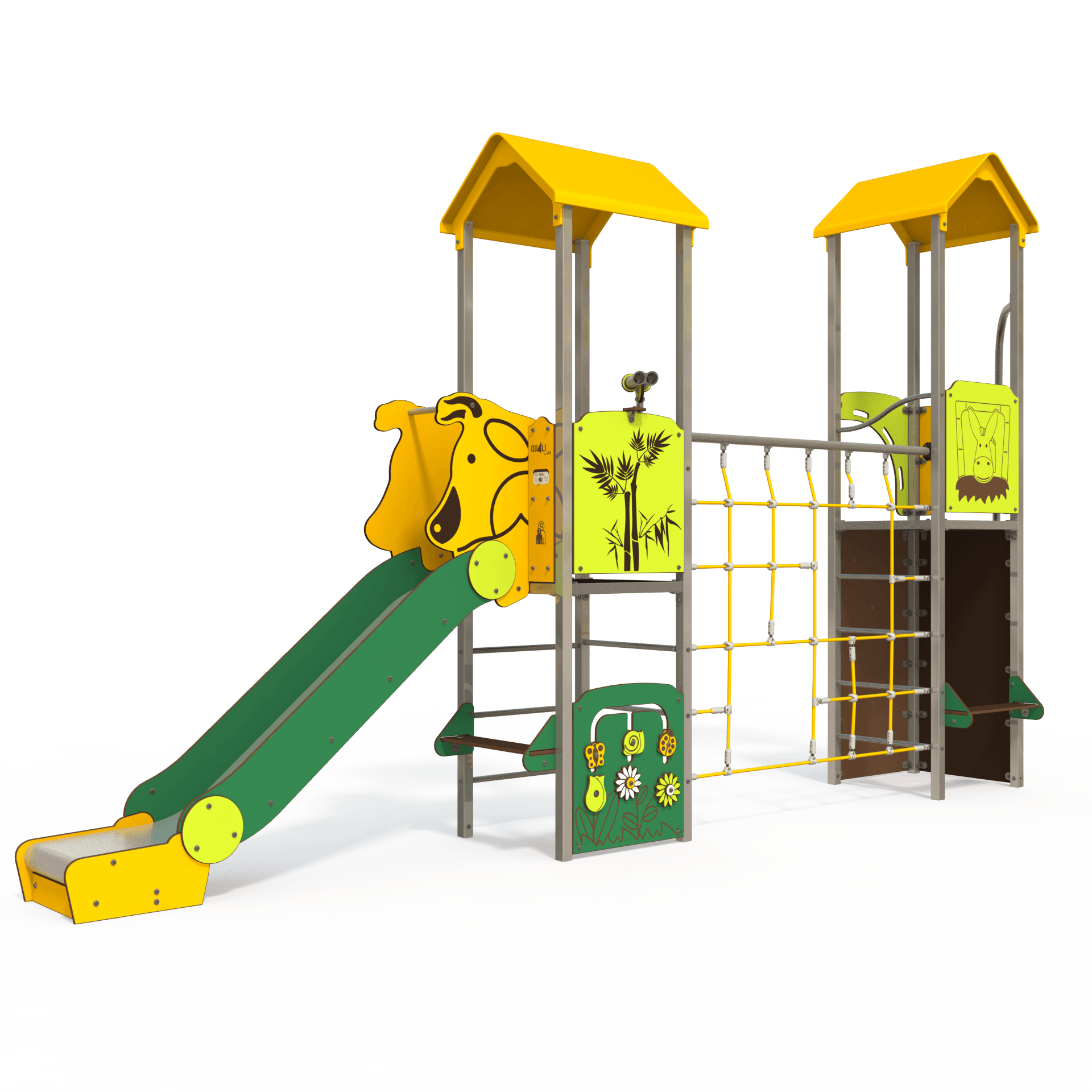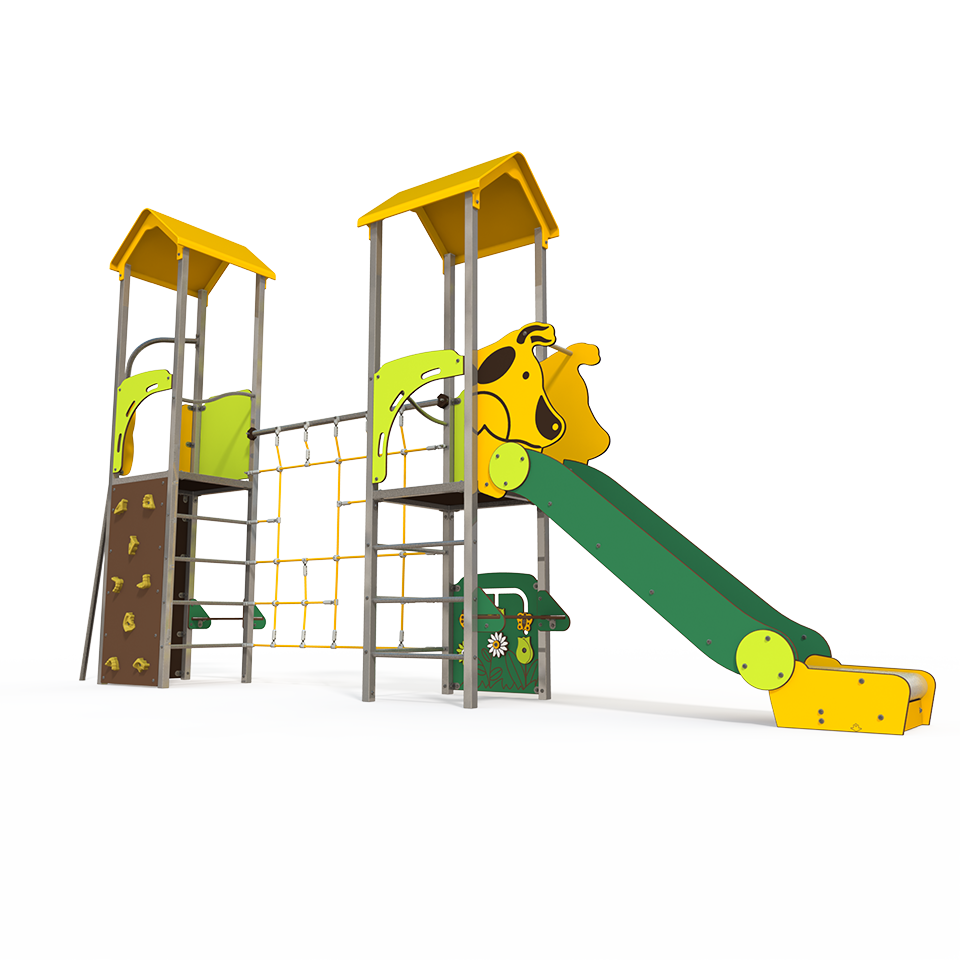 The OS 12-2012 Osmoz steel multiplay unit offers themed panels, slides, and climbing activities. Designed for children aged 3–12 years, it encourages active, imaginative play in outdoor spaces.