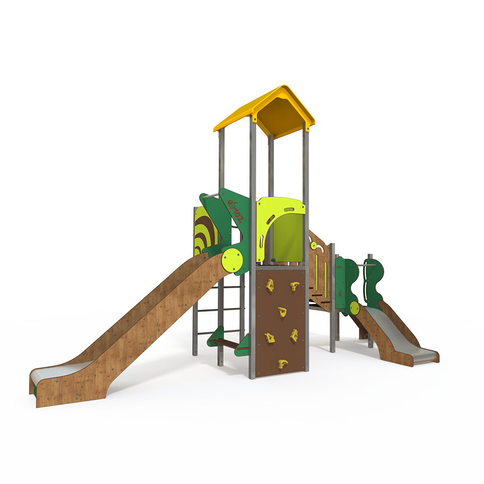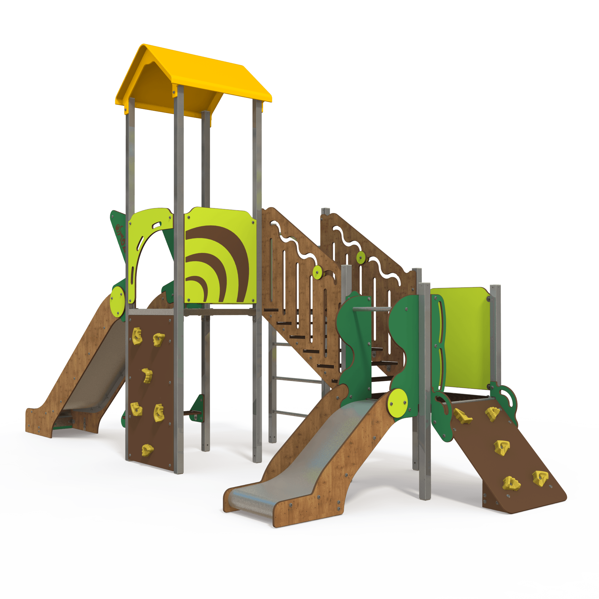 The OS 12-2013 Osmoz steel multiplay unit offers themed panels, slides, and climbing activities designed for children aged 3–12 years. Durable and engaging, it encourages active play and social interaction in outdoor playgrounds.
