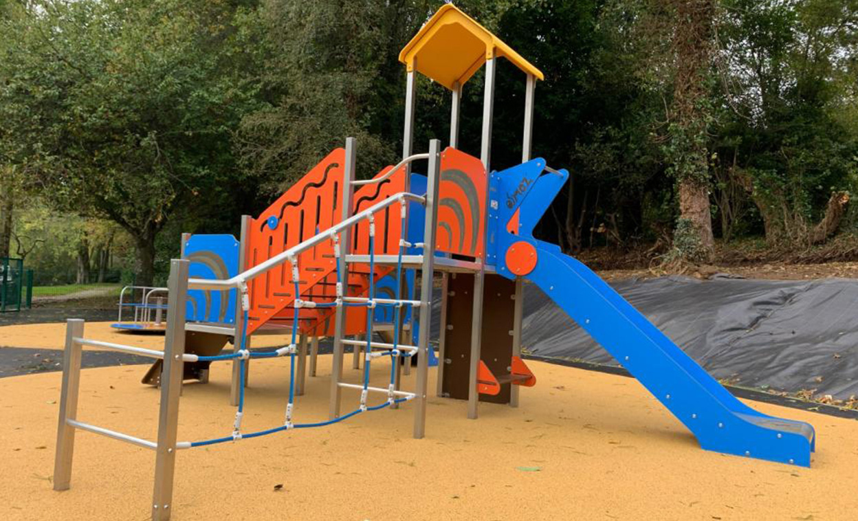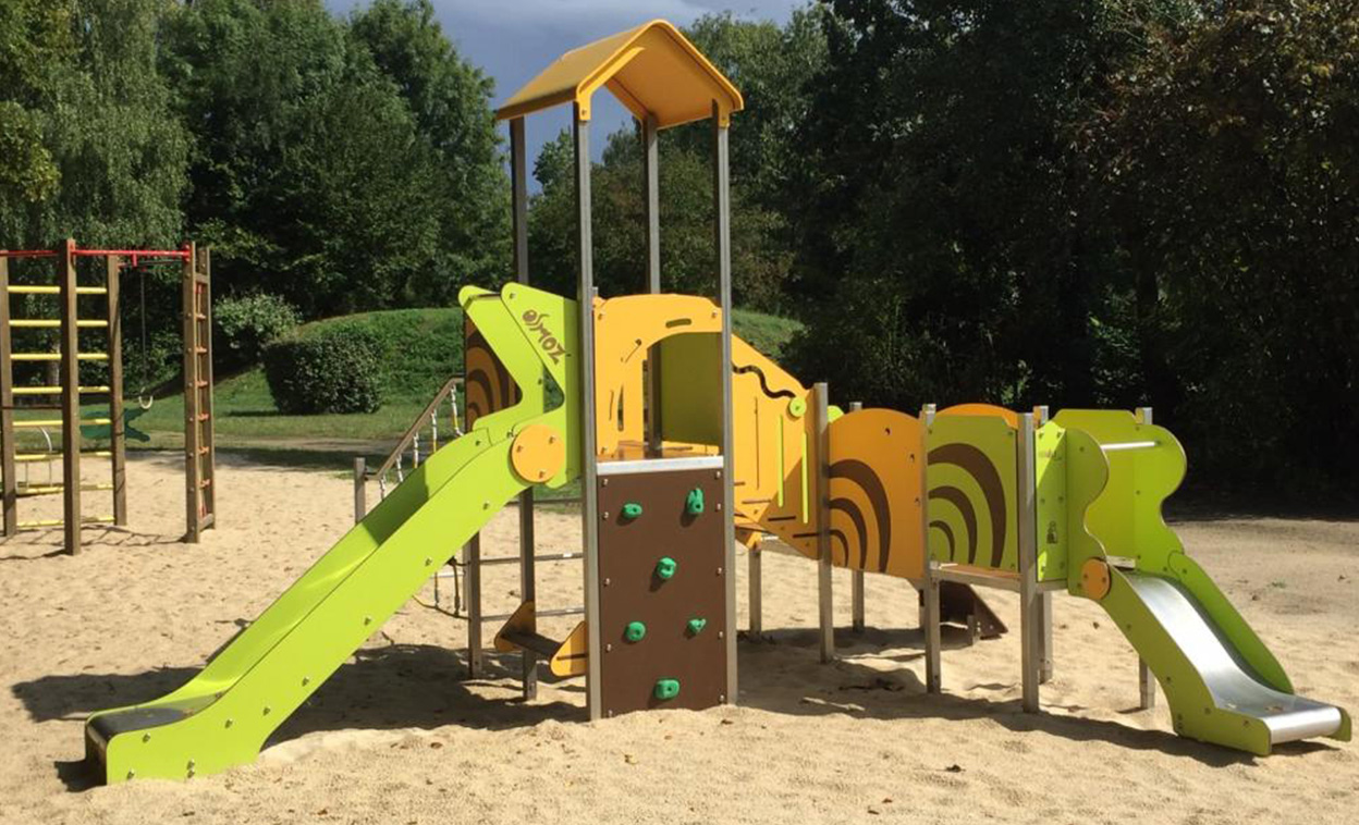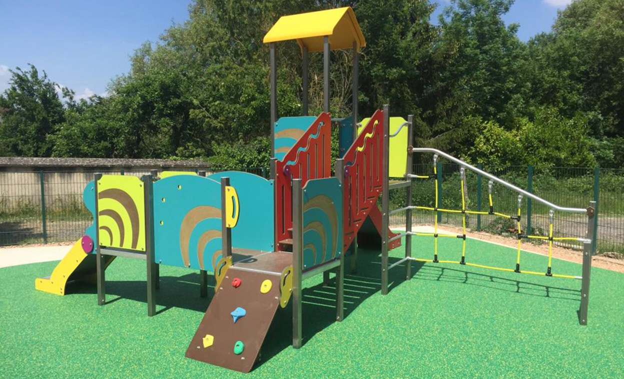The upper section is suited to older children and features a larger climbing wall, slide, climbing net, horizontal bars, ladder, stairs and integrated seating. This makes the unit a strong choice for playgrounds seeking one central play feature that encourages shared play and physical development.