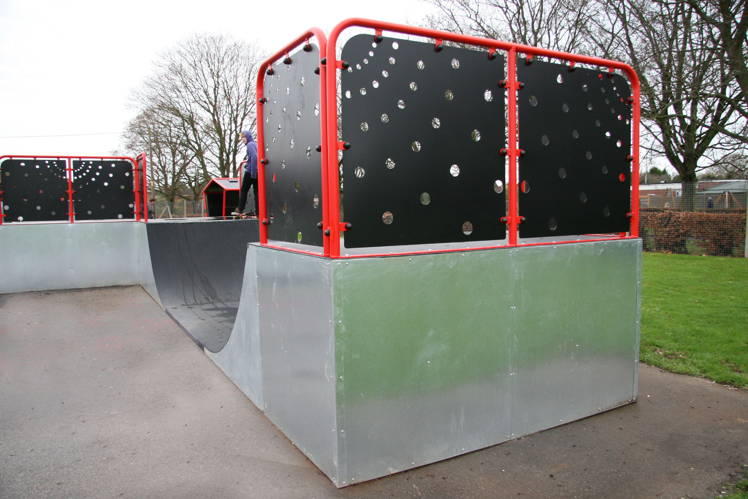 A fantastic Skate Park bundle offering 7 Different Ramps with exciting skate park equipment.Featuring Half Pipe SB-002, Flatbank SB-006, Funbox SB-009, Handbox Rail SB-031, Quarter Pipe SB-001, Spine Ramp SB-005 and Step Grind Double SB-030.Manufactured from heavy duty steel angle frame with 6mm thick solid steel skating surface and SkateActive textured surface coating for for grip and noise reduction. Handrails, grind-rails and kickers all galvanised steel with side cladding (as required) manufactured from galvanised steel sheet clad internally with marine grade ply to aid noise absorption. BS EN14974 compliant.