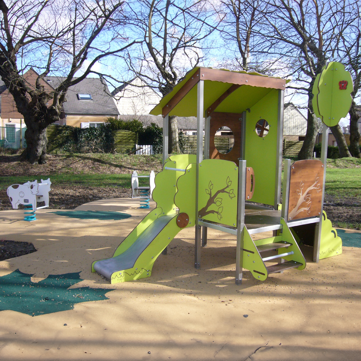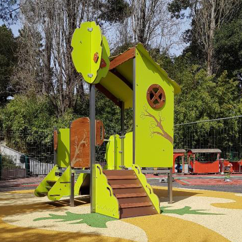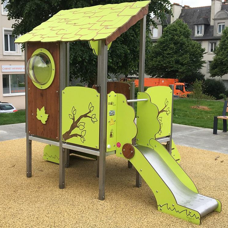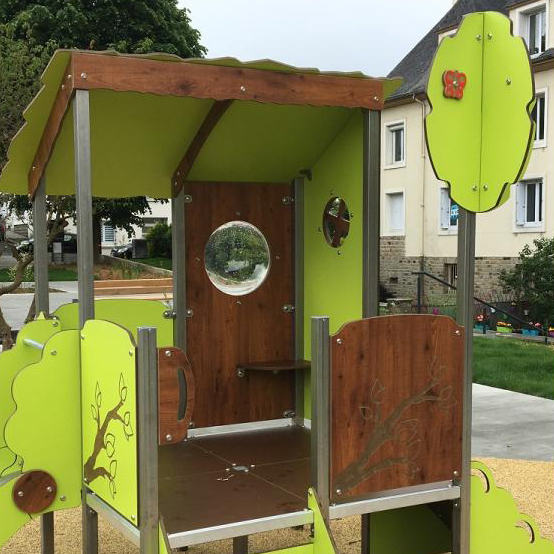 Our lovely nature playhouses are perfect for all locations. This playhouse features a slide, stairs and climb ramp.