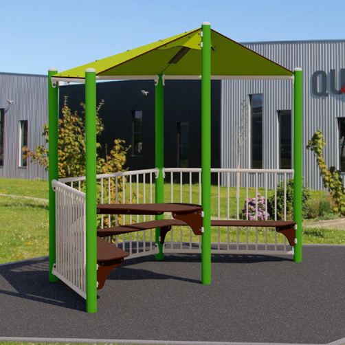 This lovely shelter is perfect for any outside location. With a capacity to fit 12 people inside this is perfect for sheltering from the rain or sun. With seating and a small table space, this is perfect to go onto grass, tarmac, or other surfacing spaces.