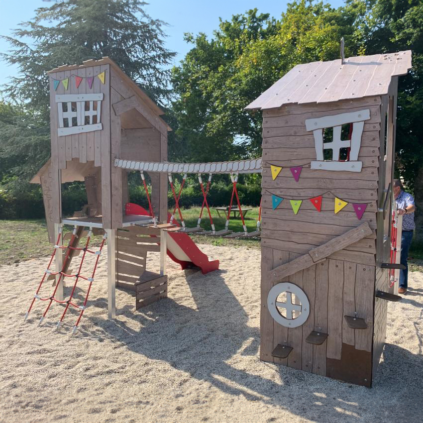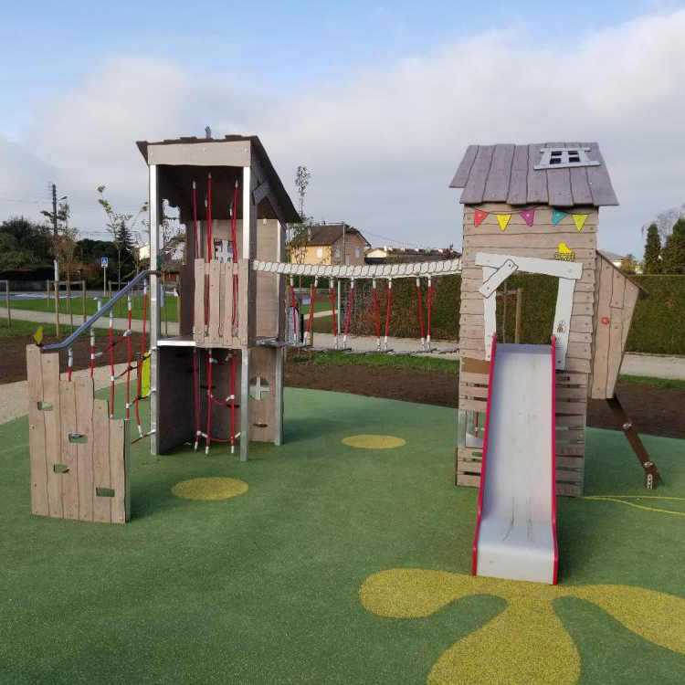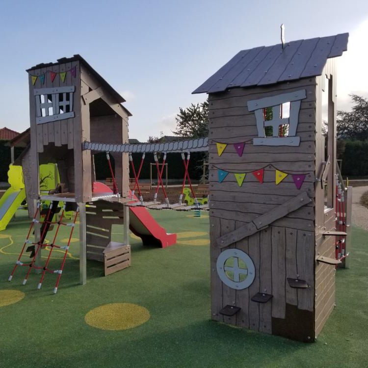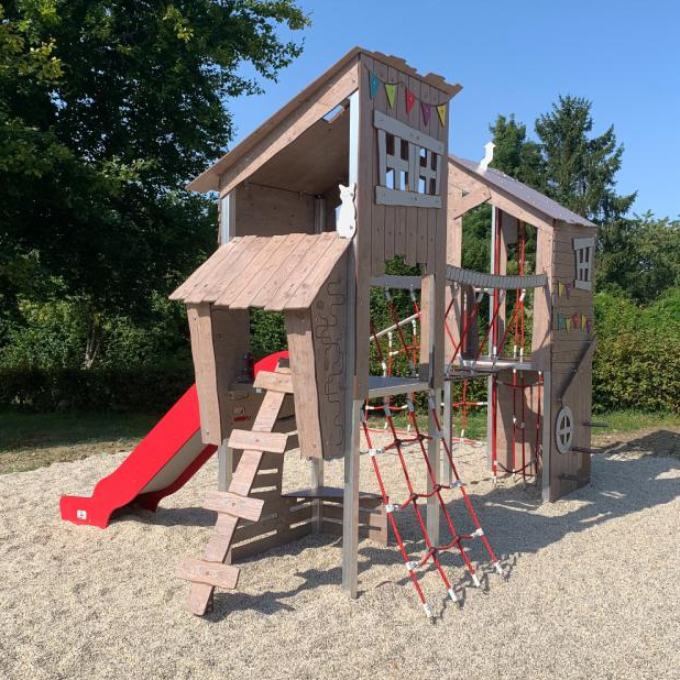 Looking for wood but don’t want the maintenance? The Ka Hute range is perfect, it looks like wood but is durable long-lasting HPL panels! Helping your playground last in the elements and from heavy use!This delightful timber fort offers two platforms, bridges, nets, slides and playhouses with delightful extra features such as windmills and bunting.